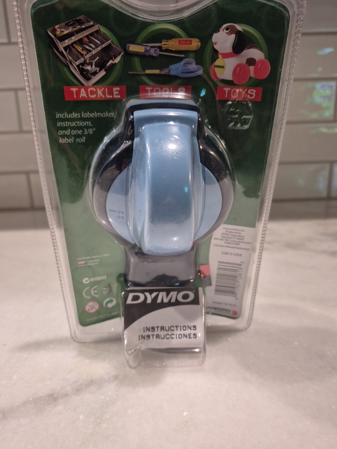 The product is a Dymo Label Buddy embossing label maker that uses Dymo D1 label tape in white color with a width of 3/8 inch. It is sealed and new, suitable for creating labels in a business or office setting.