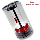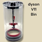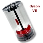 This is a Dyson V11 Dust Bin Canister for the Absolute Animal Cordless Vacuum Cleaner. It is made of clear plastic with a capacity of 0.5 liters. The canister is compatible with the Dyson V11 model and features a lightweight, easy-to-clean design. It is a new unit with a gloss finish, measuring 7.5 inches in height, 4.5 inches in width, and weighing 11 ounces.
