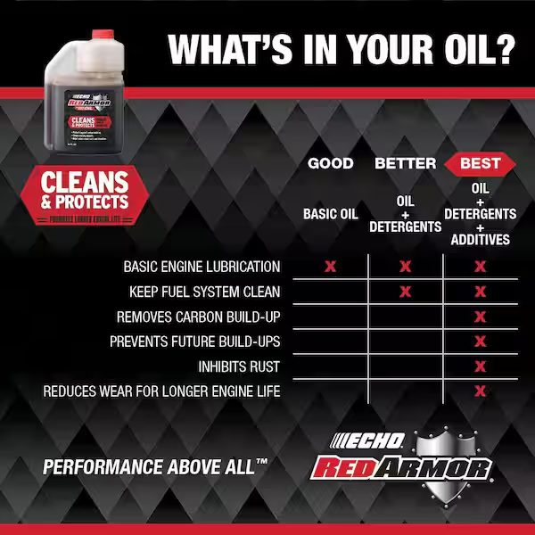 ECHO Red Armor 16 oz. 2-Stroke Cycle Engine Oil Red Armor 16 oz. oil is the perfect partner to add to 6 Gal. of fuel to help protect your 2 cycle engine from carbon build-up while cleaning existing deposits. By using powerful detergents to remove performance robbing carbon deposits, Red Armor Oil, does so without sacrificing lubrication or film strength. Mixing Red Armor oil in combination with regular fuel helps to properly lubricate engine components, For questions about service and repair, please call Echo at 1-800-432-ECHO or reference the Service & Repair document 16 oz. oil (squeeze bottle) to 6 Gal. of fuel Protects engines against future carbon build-ups Extends life of engine Stabilizes fuel for up to 2 years (when added to fresh fuel) Compatible with ECHO, Husqvarna, Shindaiwa, Stihl and other equipment brands