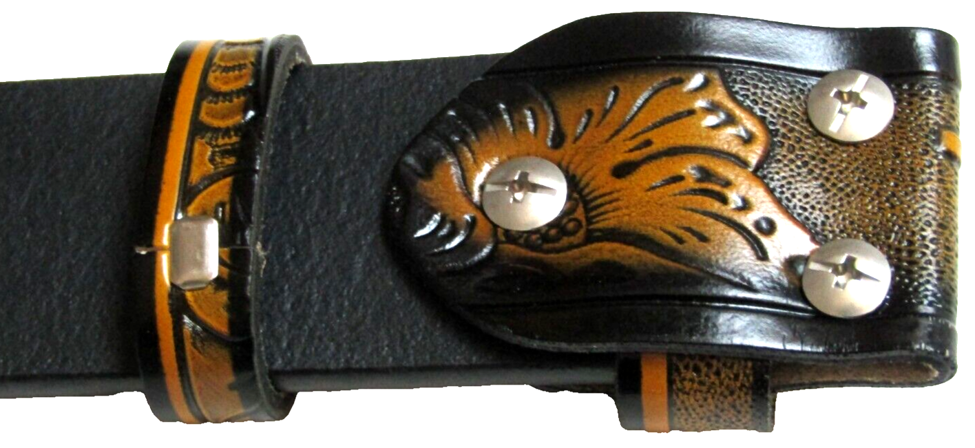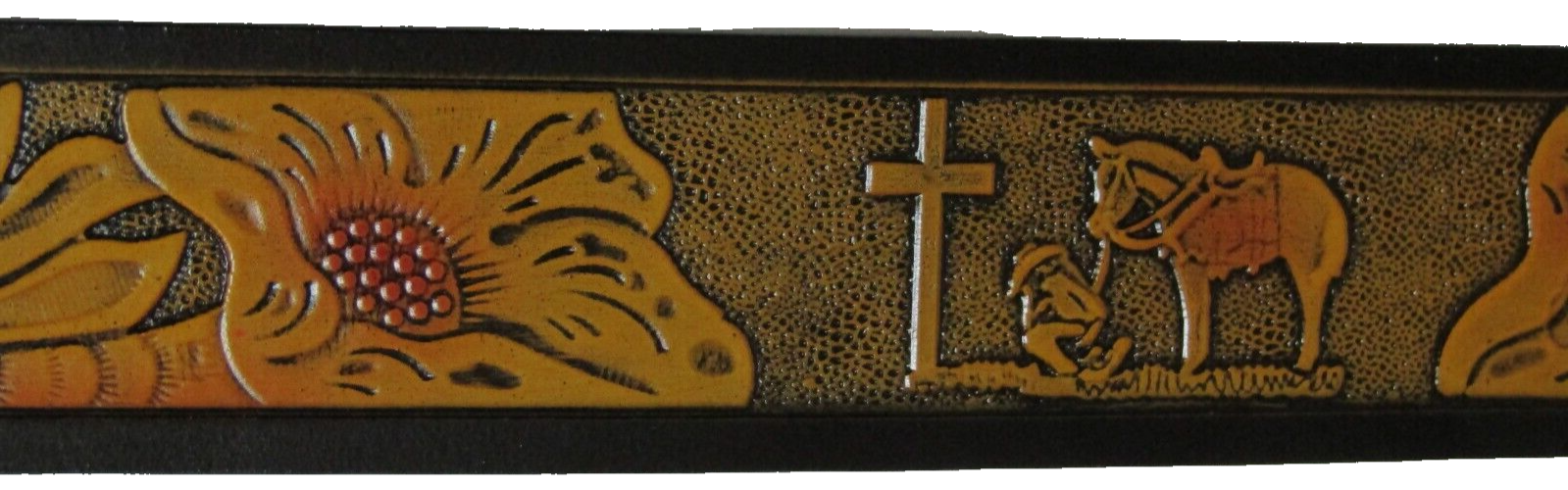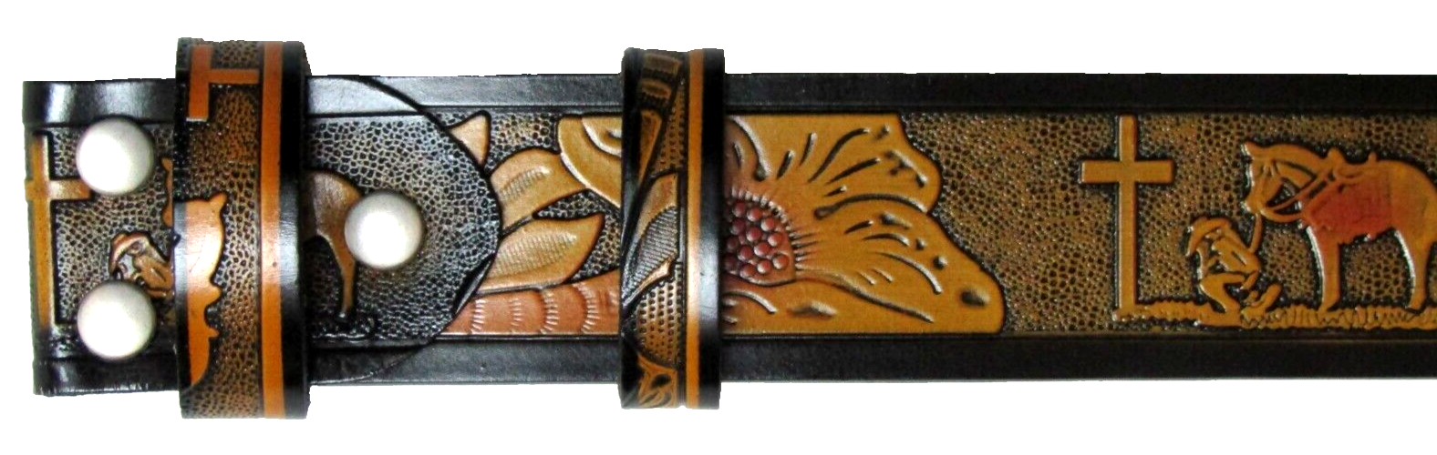 Leather Belt, "EMBOSSED FAITH" in black and brown, featuring a floral pattern and adjustable size of 120cm x 4cm. This Western style belt is accented with embossed details and made of high-quality leather. Perfect for unisex adults, this belt is a stylish addition to any wardrobe with its faith-themed design. Free shipping and includes a hole punch for custom fit. Cut to size!