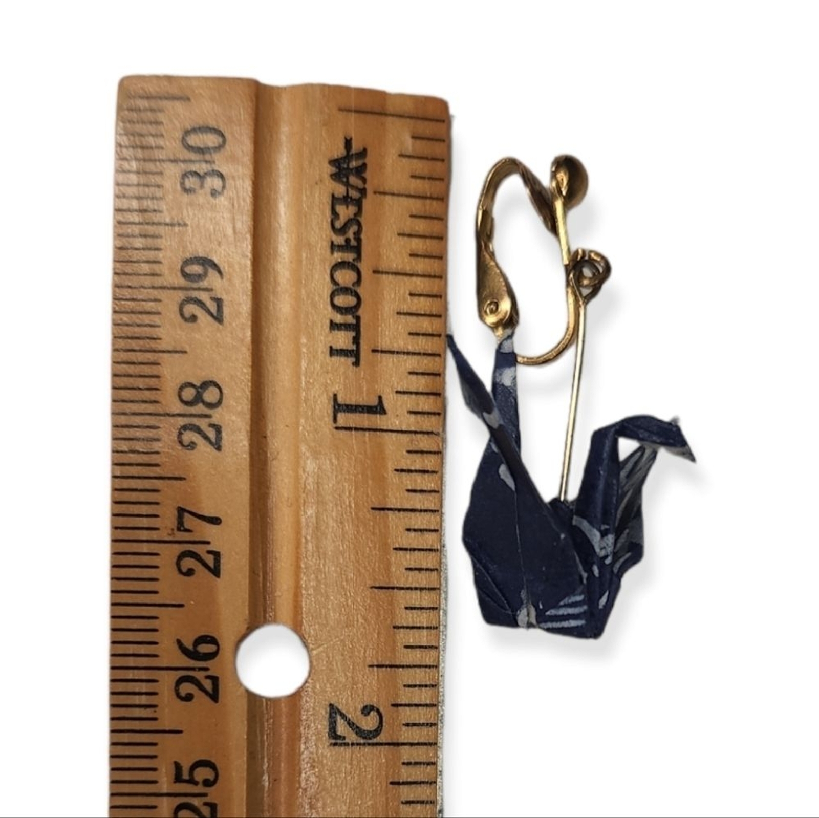 These are a neat pair of origami paper cranes made with blue and white floral paper and have gold tone hardware. There are no issues with them.