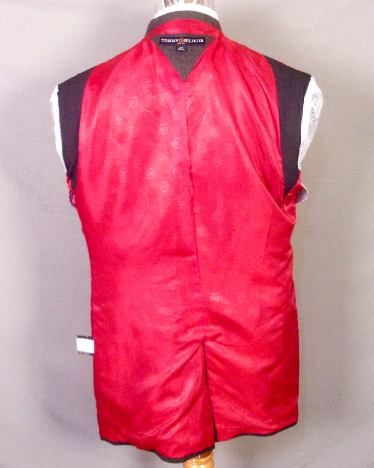 Looks superb throughout with no flaws to be seen anywhere, ultra clean and sharp inside and out with a fresh, crisp feeling interior lining too. Ready to be worn literally right now! Features a solid gray all wool tweed woven shell, very soft wool, more so than usual. It has a single breasted, two button front style with patched on, flap front waist pockets, a classic breast pocket, and notch lapels. The sleeve cuffs have four buttons apiece; the interior is fully lined with a gorgeous red satin lining that has geometric repeating Tommy crest logos all over, also all interior labels and lining pockets are very sharp, all fabric tags/size tags still present and superb. Lastly then it has a single vent in the rear. So nice! Measurements: Bust: 46 Waist: 43 Sleeve length: 25.5 (1.5 extra to let out) Length: 32.25 Lapels: 3.5 Shoulders: 19.5