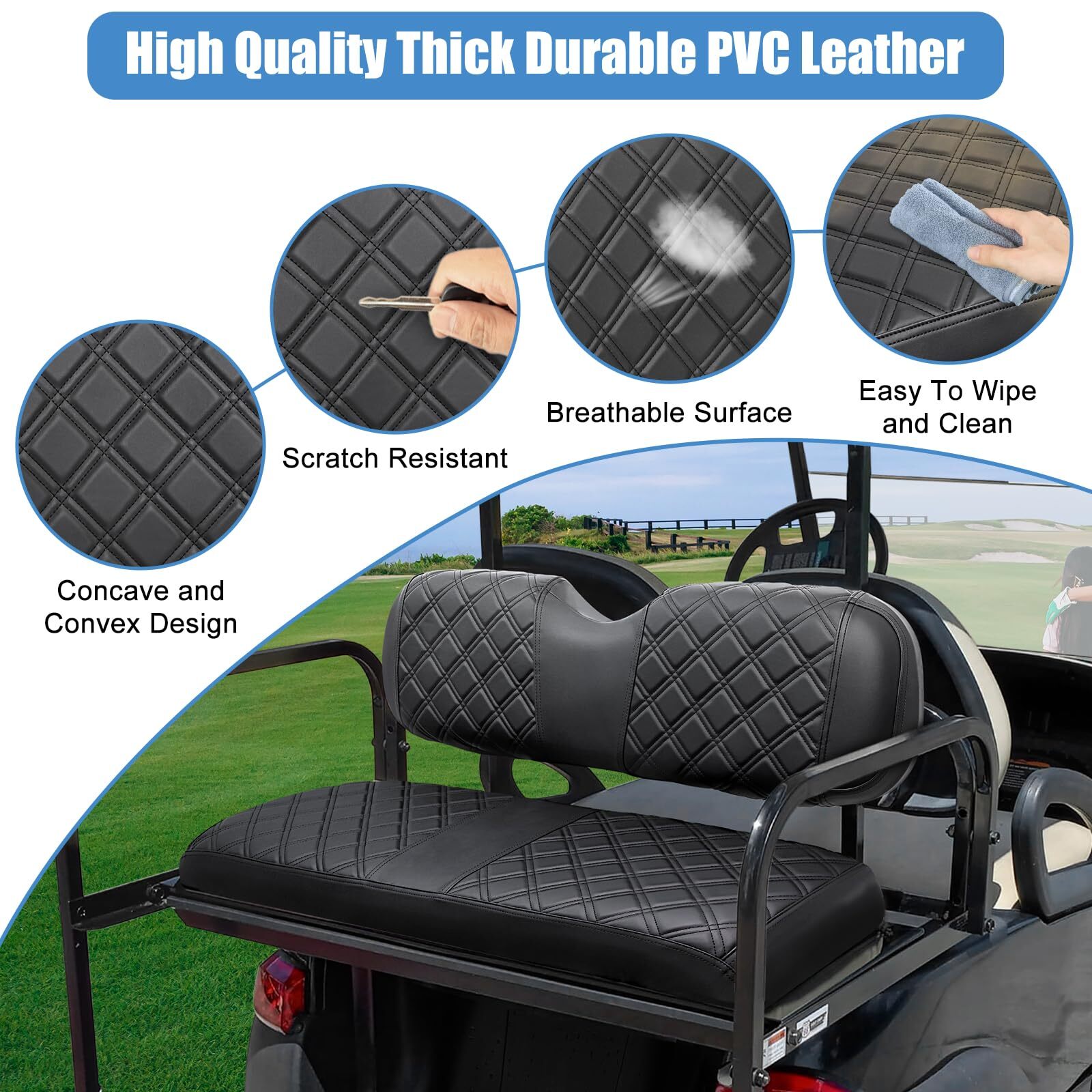 Golf Cart Rear Seat Covers for EZGO Club Car Yamaha Aftermarket Rear Seat Cushion, Rear Seat Cover with Concave and Convex Design, Thick Vinyl Leather Comfortable, Breathable & Easy to Clean ✅ FIT Models: Golf cart rear seat covers is only suitable for a common seat cushion for aftermarket rear seat kits of EZGO,Yamaha, Club Car and Icon golf carts. This golf cart rear seat cover kit contains 1*Back backrest cover (about L36 x W10 x H3.8 inches) and 1*Back Bench seat cover (about L38 x W14 x H3.8 inch). Please measure the size of seat before purchasing. ✅Luxury Appearance: Golf cart rear seat cover adopts a unique square stitching form, seat covers inner layer are made of thick breathable sponge, reducing body pressure and fatigue while improving ride comfort. Concave and convex design appearance, make your golf cart look more luxurious. ✅Premium Material: Seat cover is made of high-quality breathable PVC faux leather, which is very soft, harmless, durable, scratch-resistant, and easy to clean. It is resistant to wear and tear as well as UV exposure, eliminating concerns of cracking and fading. ✅Upgrade Design: ①Smooth vinyl PVC leather material and black color make it easy to clean and dirty resistance. ②Square concave and convex design appearance makes your golf cart brand new and fashion. ③Adjustable shoulder straps and retractable buckles design make install easily. ✅Easy Installation: Golf cart black leather seat cover is a fully molded seat cover that perfectly covers the old seat cover of the golf cart without the use of gun nails and without removing the old vinyl seat cover. In addition, the adjustable shoulder straps and retractable buckle design help to easily install and remove in minutes. Golf Cart Seat Covers Kit for Aftermarket Rear Seat, for Common Seat Cushion, Thick Vinyl Leather Comfortable, Breathable & Easy to Clean Feature: High-quality PVC faux leather, resistant to wear and tear as well as UV exposure, no need to worry about fading and cracking. Black color and smooth vinyl PVC leather material make it dirty resistance and easy to clean. Square concave and convex design appearance makes your golf cart brand new and fashion. Package Include: 1*Back backrest cover (about L36 x W10 x H3.8 inches) 1*Back Bench seat cover (about L38 x W14 x H3.8 inch) About What can we offer ? brand has been established for more than 10 years now, it is a professional manufactuer of golf cart accessories, we could offer most kinds of accessories mainly in brand Club car, Ezgo, Yamaha.We are still constantly adding and updating our products. Shipping We offer FREE shipping on all orders! We ship within Three business days of payment, usually sooner. We use a selection of shipping services such as UPS, FedEx, USPS etc. We only ship to the lower 48 states, no APO/FPO addresses or PO Boxes allowed. Local pickups and combined shipping options are not provided at this time. Return You can return a product for up to 30 days from the date you purchased it. Any product you return must be in the same condition you received it and in the original packaging. Please keep the receipt. Payment We accept payment by any of the following methods: PayPal Please pay as soon as possible after winning an auction, as that will allow us to post your item to you sooner! Feedback Customer satisfaction is very important to us. If you have any problem with your order, please contact us and we will do our best to make you satisfied. Contact Us If you have any queries, please contact us via ebay. We usually respond within 24 hours on weekdays. Please visit our eBay store to check out other items for sale! Thank you for shopping at our store.