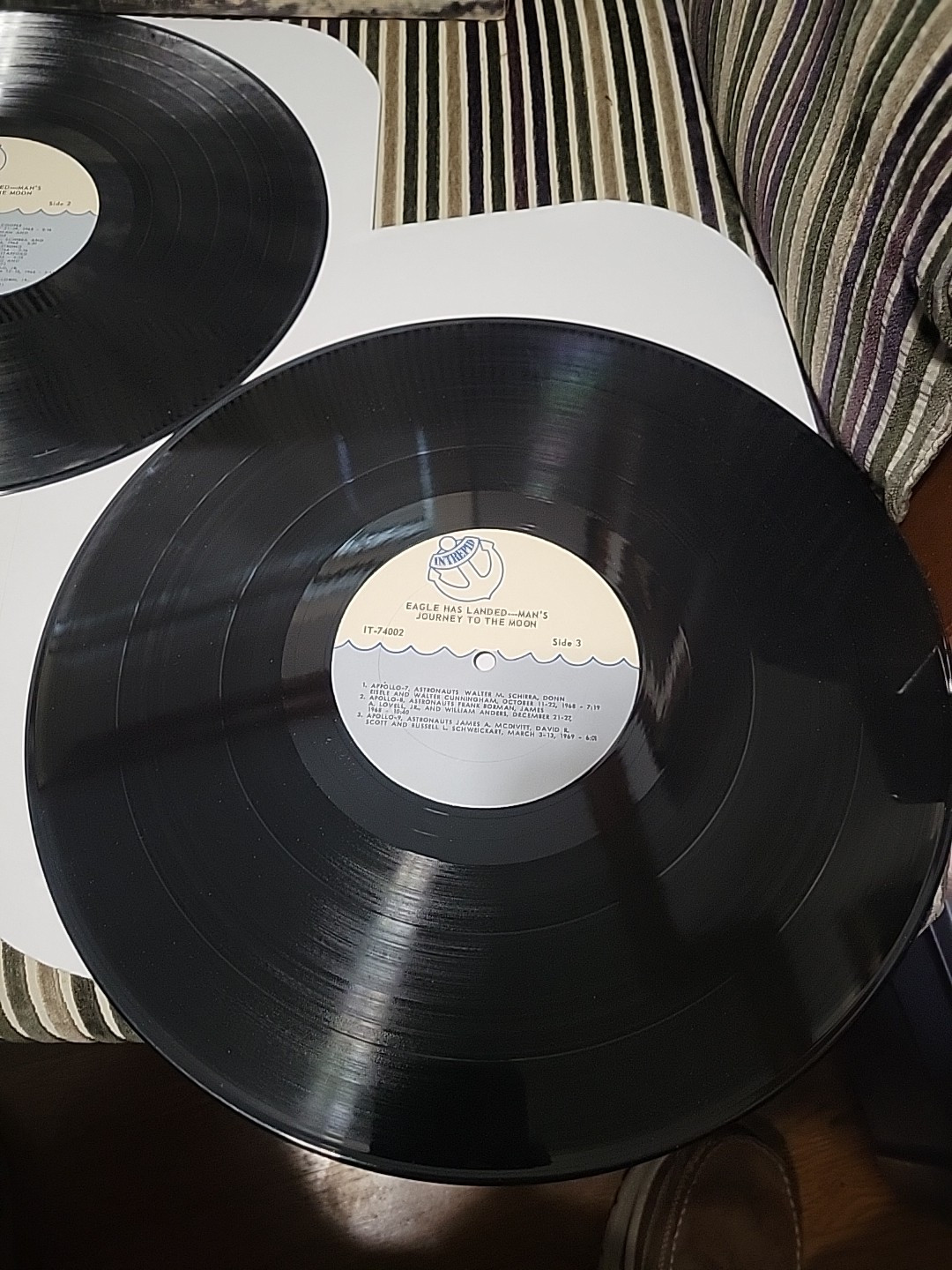 The product is a double LP vinyl record titled "Eagle Has Landed" released by UPI Reporters on Intrepid Records in 1981. This first edition, limited edition, first pressing features news reports and commentary in English from the 1980s. The records are in near mint condition and come in a gatefold cardboard sleeve with original cover art. The 33 RPM record has a stereo sound and includes sound effects, nature sounds, and spoken word content, making it a unique addition to any vinyl collection. There is a 2 in. Taping on one of the top edges.