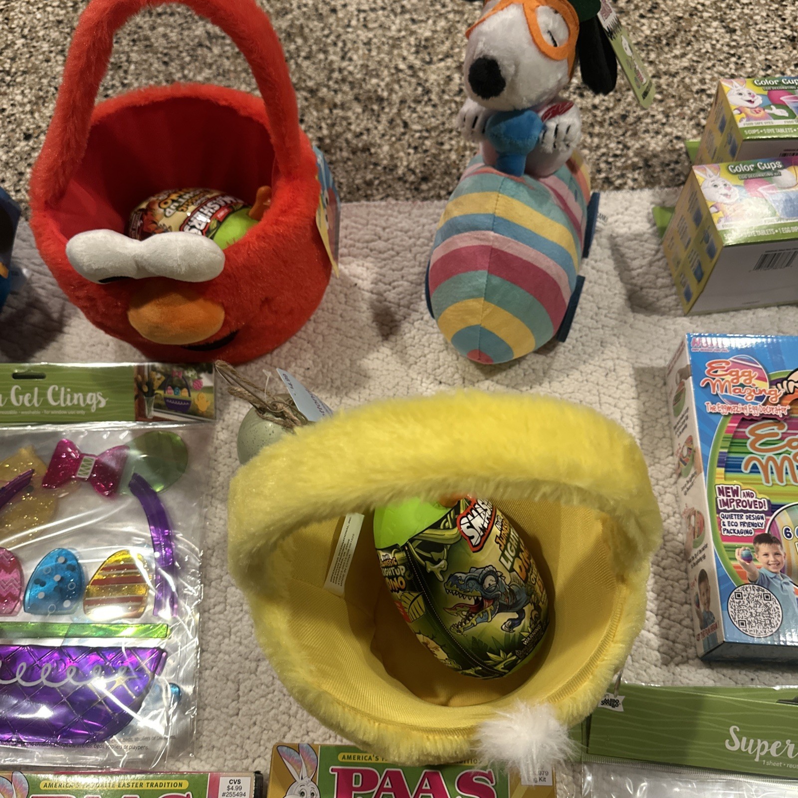 32 piece Easter bundle Steal!!! 4 Baskets(Elmo, and Cookie Monster included,)2 Snoopy Animated Easter Plush Stuffed Animal in Egg Car toy decorations for Mom and 2 ceramic eggs. 6 egg colored cups, 6 over sized easter, decorations for windows, and one egg marker machine to decorate the eggs, no need to go shopping and deal with lines and headaches and impatient rude people grab this why it’s still here! You wanna see deals like the ones “tradingnerd has deals for you on eBay !!!!!