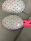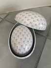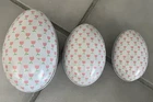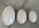 The Easter Tin Litho Nesting Eggs by Russ Berrie are charming candy containers perfect for celebrating the holiday. Made of pink tin with a beautiful tulip design, these nesting eggs are a charming addition to any Easter decor. Imported from Hong Kong, these collectible items add a touch of whimsy to your holiday celebrations. Measurements 5” egg 4” egg 3.5” egg As is