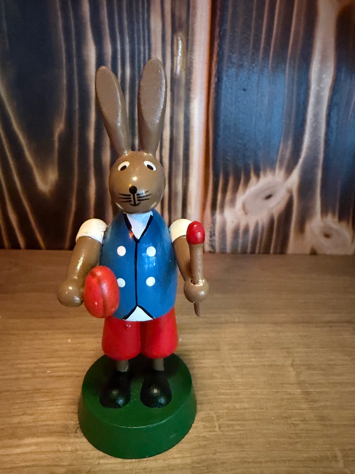 Langohr Osterhase – handbemalte Holzfigur mit Charme Dieser freundliche Osterhase mit langen Ohren bringt sofort Frühlingsstimmung ins Zuhause. Mit seiner klassischen Haltung, den kräftigen Farben und den liebevollen Details wirkt er wie ein kleines Stück vergangener Osterzeit. Der Hase ist aus Holz gefertigt und sorgfältig bemalt. In den Pfoten hält er ein rotes Ei und ein weiteres kleines Detail, was ihm einen besonders verspielten Ausdruck verleiht. Ideal als Tischdekoration, für das Fensterbrett oder als Teil einer Osterlandschaft. Durch seine zeitlose Gestaltung passt er sowohl zu nostalgischer Osterdekoration als auch zu moderner Frühlingsdeko. Details: Motiv: Osterhase mit langen Ohren Material: Holz Farbe: Mehrfarbig, handbemalt Höhe: ca. 9–10 cm (geschätzt) Zustand: Gebraucht, gut erhalten (siehe Fotos) Hinweis: Die Herkunft des Hasen ist unbekannt und wird daher bewusst nicht angegeben. Es handelt sich um einen dekorativen Osterartikel ohne Herstellerzuordnung. Ein liebevolles Stück für alle, die klassische Osterfiguren und gemütliche Frühlingsdeko mögen.