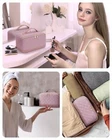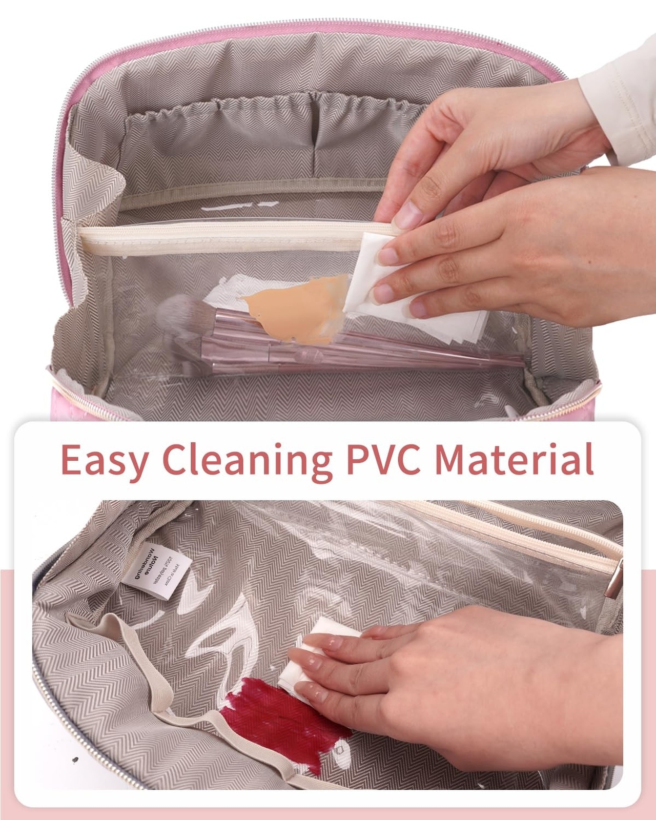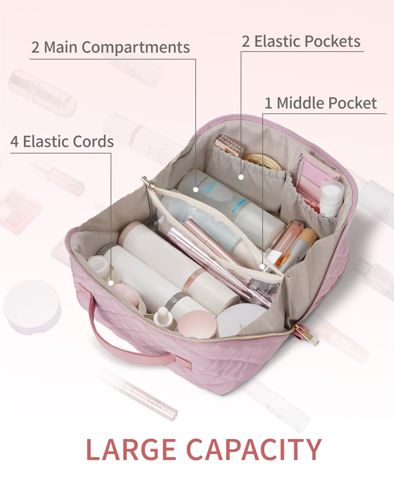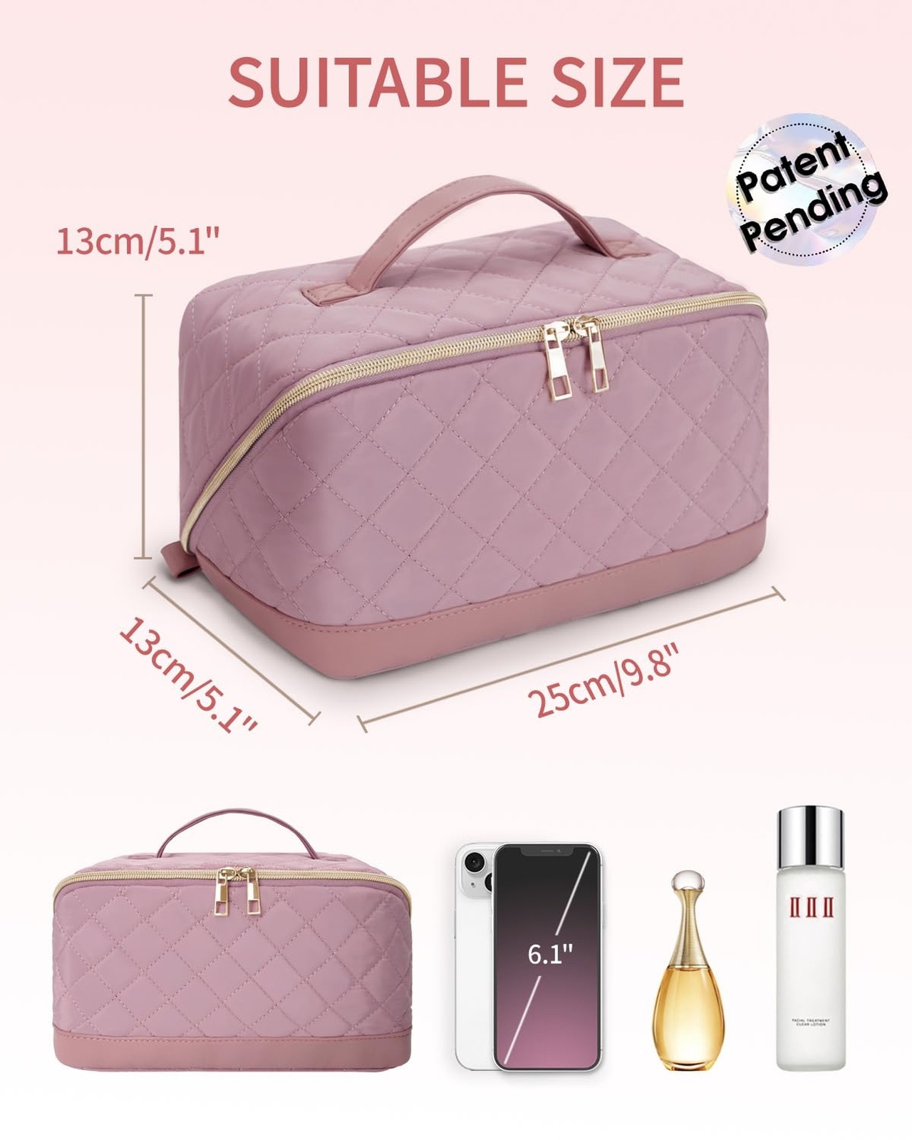 Wandering Nature Travel Makeup Bag,Wide-Open Make up Bag with Large Capacity,Quilted Makeup Organizer Bag, Open Flat Toiletry Bag for Women Cosmetic Pouch with Divider and Handle,Patent Pending Product Details Color: Pink Brand: Wandering Nature MPN: WN05172 UPC: Does not apply EAN: Does not apply Product Dimensions: 9.84 x 5.12 x 5.12 inches Item Weight: 8.4 ounces Department: Women Manufacturer: Wandering Nature Country of Origin: China Item model number: WN05172 Large Capacity Measuring 9.84 x 5.12 x 5.12 inch. The large coquette makeup bag offers roomy space for all daily-used cosmetics and toiletries. Features 2 main compartments, 2 elastic pockets,4 elastic cords and 1 clear pocket for organized storage Easy-cleaning Material The travel makeup case is equipped with a PVC dirt-proof makeup brush pocket to hold your brushes, sponges and power puffs.The bottom of the main compartment of the bag is covered with PVC material,which makes you clean easily, and you won't worry about the bag or items get dirt anymore Quick Access The wide-open flat makeup bag makes it easy to find and reach your daily cosmetics, skin-care products, toiletry accessories. Open up completely, and just close the zipper for easy storage DetailsBottom pull tab and double zipper design is convenient for smooth closure.Top leather carry handle is portable to carry. It is made from high-quality quilted fabric for a soft, lightweight, and durable feel Multipurpose Use This travel makeup bag organizer can be used as a skincare bag,travel cosmetic bag,layflat toiletry bag, travel makeup pouch or daily storage bag. It's also a ideal gift for birthdays, anniversaries, Valentine's Day, Mother's Day, Women's Day, Christmas(Patent Pending)