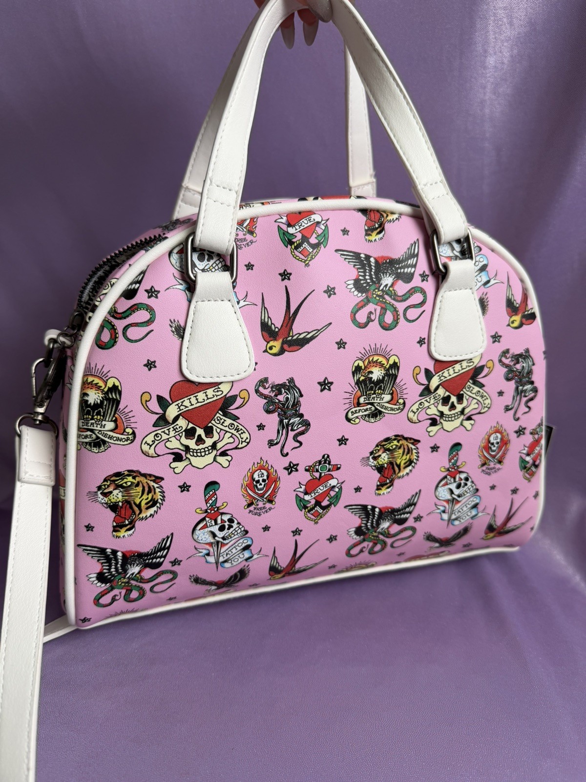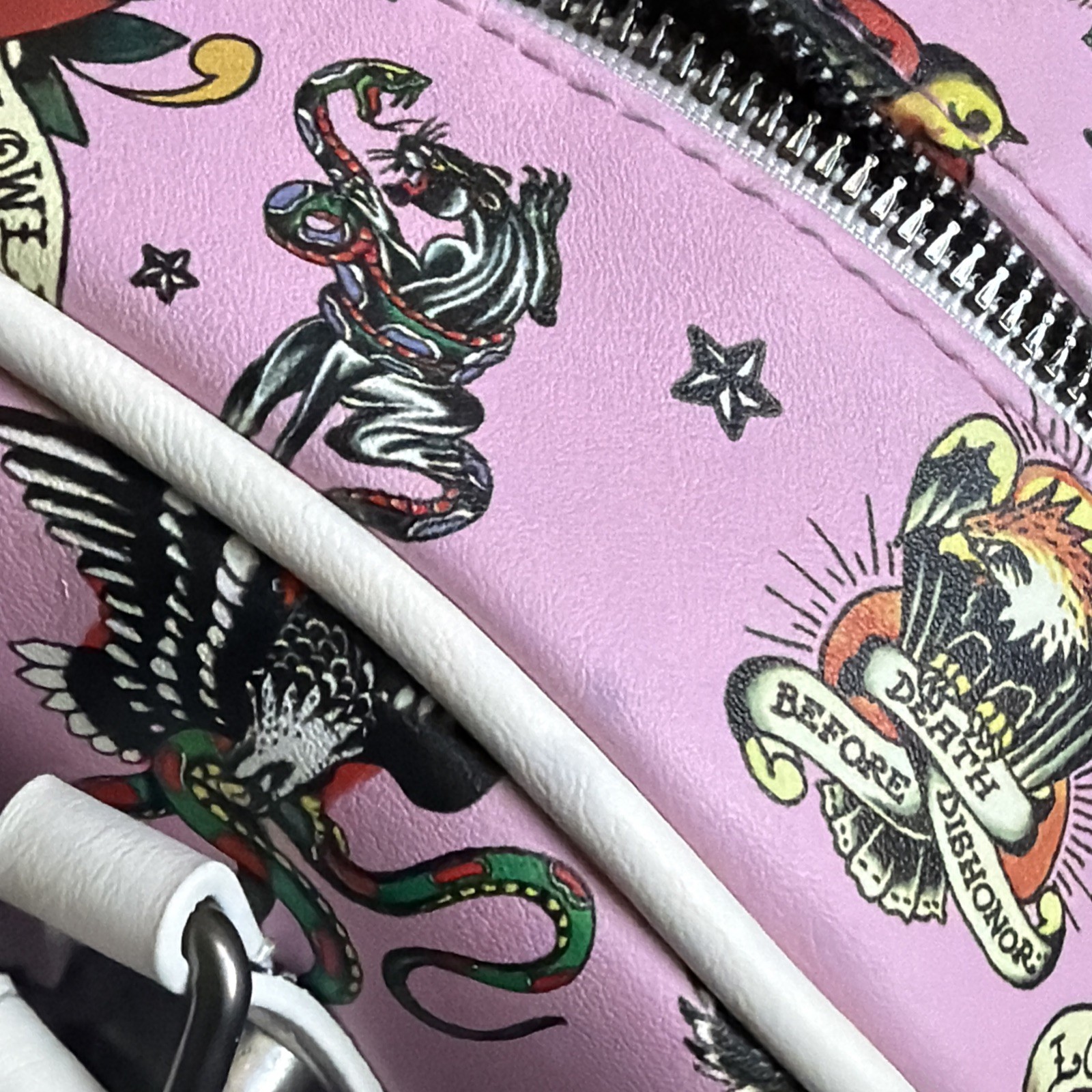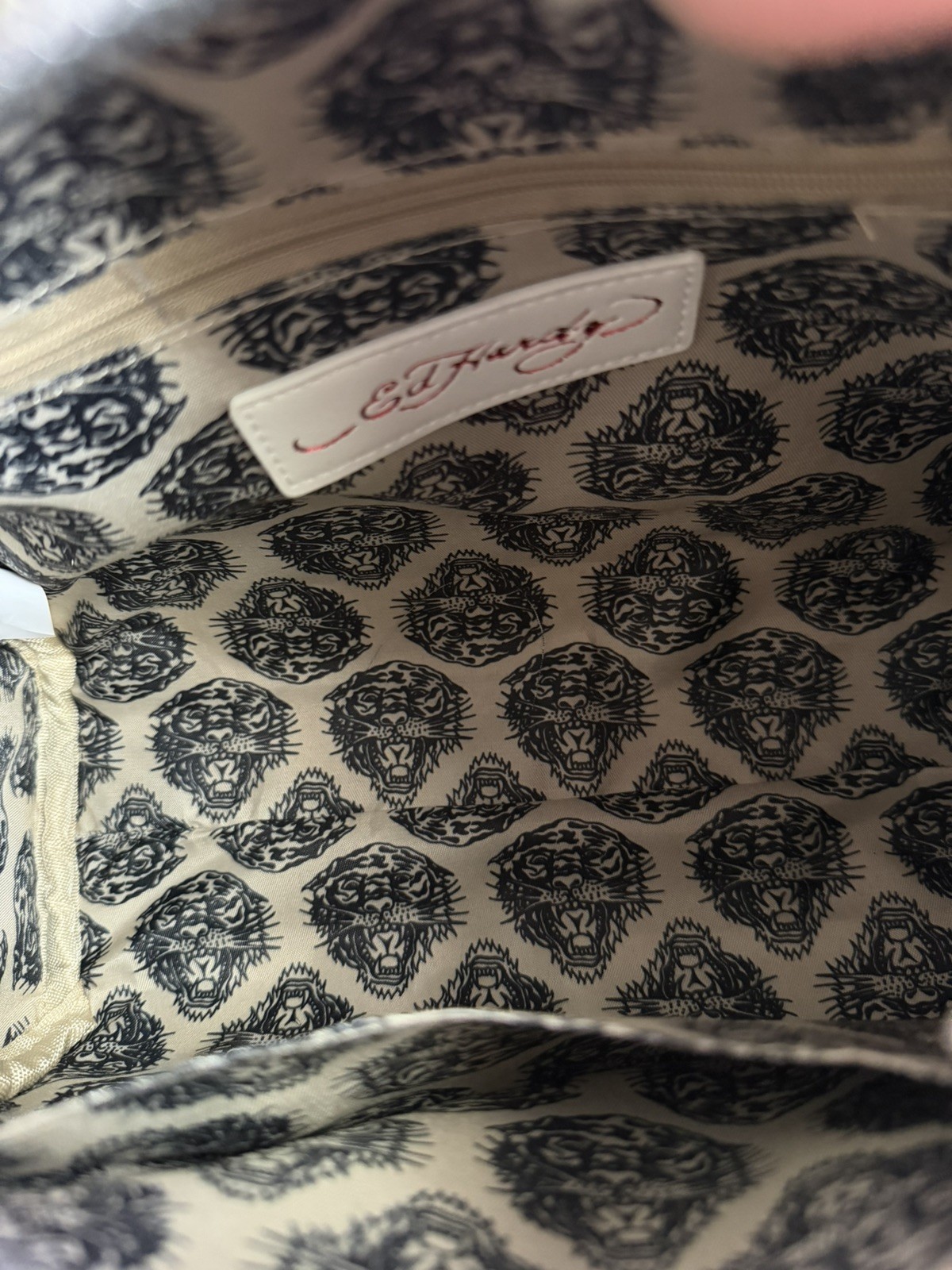 Condition: New with Tags (NWT) Notes: Minor cosmetic flaw — slight discoloration on the white edge (see photos). Does not include the original heart shaped coin purse charm. Fully functional. Measurements (approx.): 11” W x 9” H x 5” D The Ed Hardy Tattoo Women’s Skull & Roses Print Satchel Crossbody Bag features a bold, iconic design with a pink faux leather exterior showcasing roses, hearts, skulls, and signature Ed Hardy tattoo graphics. This medium-sized rectangular bag includes a secure zip closure, double white top handles, and an adjustable, detachable shoulder strap for versatile styling. Finished with gunmetal hardware, this lightweight bag is perfect for casual outings, travel, festivals, or statement looks. A great piece for lovers of Y2K, 90s, tattoo, and edgy fashion aesthetics. Mini Weekender Purse