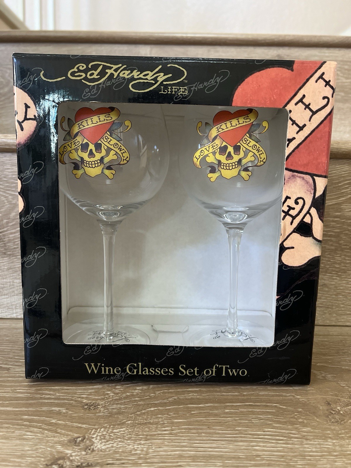The Ed Hardy Wine Glasses Set of 2 with a "Love Kills Slowly" Skull Design is a stylish and unique addition to any wine lover's collection. Made by the renowned brand Ed Hardy, these clear wine glasses feature a striking skull design that adds a touch of edginess to the glasses. Perfect for serving your favorite wines in style, these glasses are sure to impress guests and enhance any dining or entertaining experience.