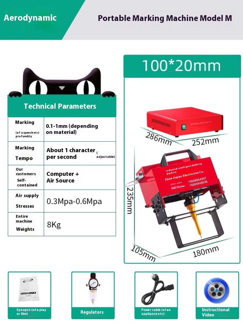 Pneumatic electric metal steel pipe steel plate mold lettering machine portable stainless steel coding machine marking machine Portable marking machine C type 170*110mm Marking depth 0.1-1mm (depending on the material) Marking speed about 1 second 1 character (adjustable) Pressure 0.3Mpa-0.6Mpa Machine weight 13Kg