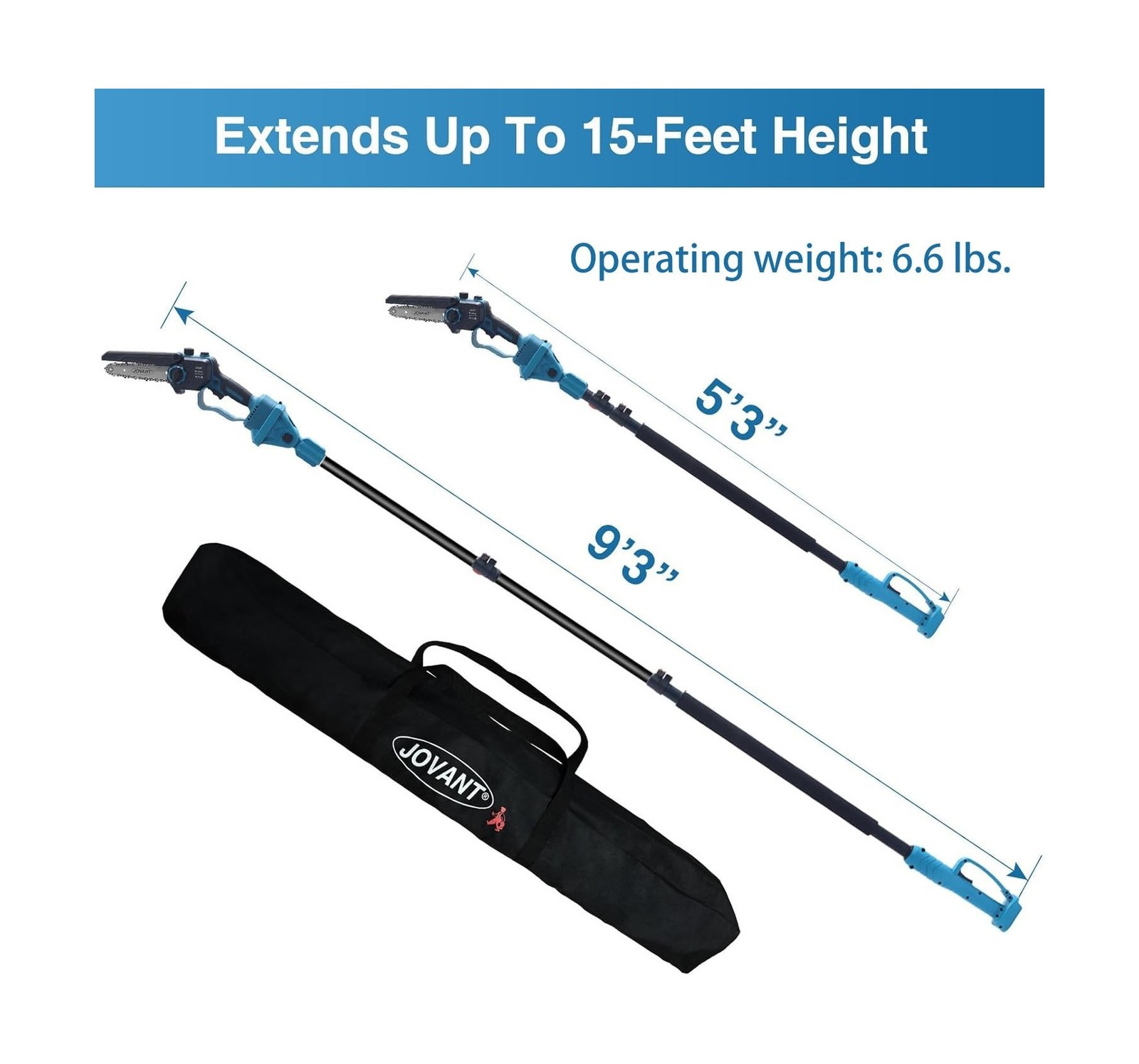 Electric Pole saw, Cordless Pole Saw Battery Powered, Pole Chainsaws for Tree Trimming, 15Ft Reach Power Pole Saws with 2*MAX Batteries Description Features: 2-IN-1 Design: 2-IN-1 pole chainsaw include a electric chainsaw and a telescopic pole to provide a versatile tool for gardening. This Electric pole saws is used for pruning trees. This electric chainsaw can be used for low-position work, while electric pole saw can be used in hard-to-reach high-position areas. Note that the product weighs 6.6 pounds with the pole attached, making it more suitable for individuals with greater physical strength. Cordless Pole Saws for Tree Trimming: Pole chainsaw have excellent efficiency, which help you cutting almost all plants in your garden, yard, park, farm and greenhouses. Pole mini chainsaw can be used for crepe myrtles, cypress trees, pepper trees, palm fronds, trees limbs, bonsai trunks, vines, fruit trees, etc. Wide Applications: Cordless pole saw has excellent efficiency, which help you cutting almost all plants in your garden, yard, park, farm and greenhouses. Battery Pole saw can be used for crepe myrtles, cypress trees, pepper trees, palm fronds, trees limbs, bonsai trunks, vines, fruit trees, etc. Package Include & Warranty: Chainsaw x 1, telescopic extension pole x 1, 4.0Ah battery pack x 2, chain 3 (1 has been mounted on the chainsaw), chain plate 2 (1 has been mounted on the chainsaw), quick charger 1, guide plate cover 1, chain protectio cover 1, chain filing 1, storage bag x 1, user manual 1. All items are packed in the portable storage bag, suitable for fields. We offer a 12 month warranty. If you have any questions, please contact us. Product Details: Brand: jovant Power Source: Battery Powered Horsepower: 880 Watts Item Weight: 2.9 Pounds Product Dimensions: 51"L x 7.5"W x 5"H Chain Length: 6 Inches Manufacturer: JOVANT Brand: jovant Power Source: Battery Powered Horsepower: 880 Watts Item Weight: 2.9 Pounds Product Dimensions: 51"L x 7.5"W x 5"H Chain Length: 6 Inches Manufacturer: JOVANT Item Weight: 2.9 pounds Item model number: PTJ-001-01 Batteries: 2 Lithium Ion batteries required. (included) Size: 9.3FT Voltage: 20 Volts Included Components: Chainsaw x 1, telescopic extension pole x 1, 4.0Ah battery pack x 2, chain × 3 (1 has been mounted on the chainsaw), chain plate × 2 (1 has been mounted on the chainsaw), quick charger × 1, guide plate cover × 1, chain protectio cover × 1, chain filing × 1, storage bag x 1, user manual × 1 Batteries Included?: Yes Batteries Required?: Yes Battery Cell Type: Lithium Ion Date First Available: January 22, 2024 Delivery We Do Not Ship Outside of the Continental US. Return Policy All items qualify for returns within 30 days of receipt. Buyer is responsible for return shipping on any item that is not damaged. Feedback We take our reputation seriously, we buy and sell online, so we understand the value of trust. If you are unsatisfied with your order, please contact us and we will work with you to resolve it to your satisfaction.