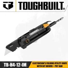 TB-H4-12-IM Electrician's Folding Utility Knife with Bit Driver + Pry Bar Electrician's Folding Utility Knife is designed for convenience and durability, with 5 built-in tools. Equipped with a wire and string cutter, as well as a prying tool, double-ended screwdriver bit (PH2/SL1-4-in), and a 1/4-in bit holder/nut driver, this knife empowers you to tackle a variety of tasks, from cutting through tough materials to prying open containers to tightening or loosening screws and bolts. The button lock ensures that the knife stays firmly in place when open, providing a reliable cutting experience. Plus, the blade-release button allows for quick, tool-free blade changes, so you can replace a dull blade or adapt to different tasks on the fly. Blade storage in the handle holds up to 3 blades. A sturdy belt clip keeps this utility knife at your side when you need it most. Elevate your cutting experience with 5-in-1 Electrician's Folding Utility Knife - a tool that's versatile, convenient, and built to last.