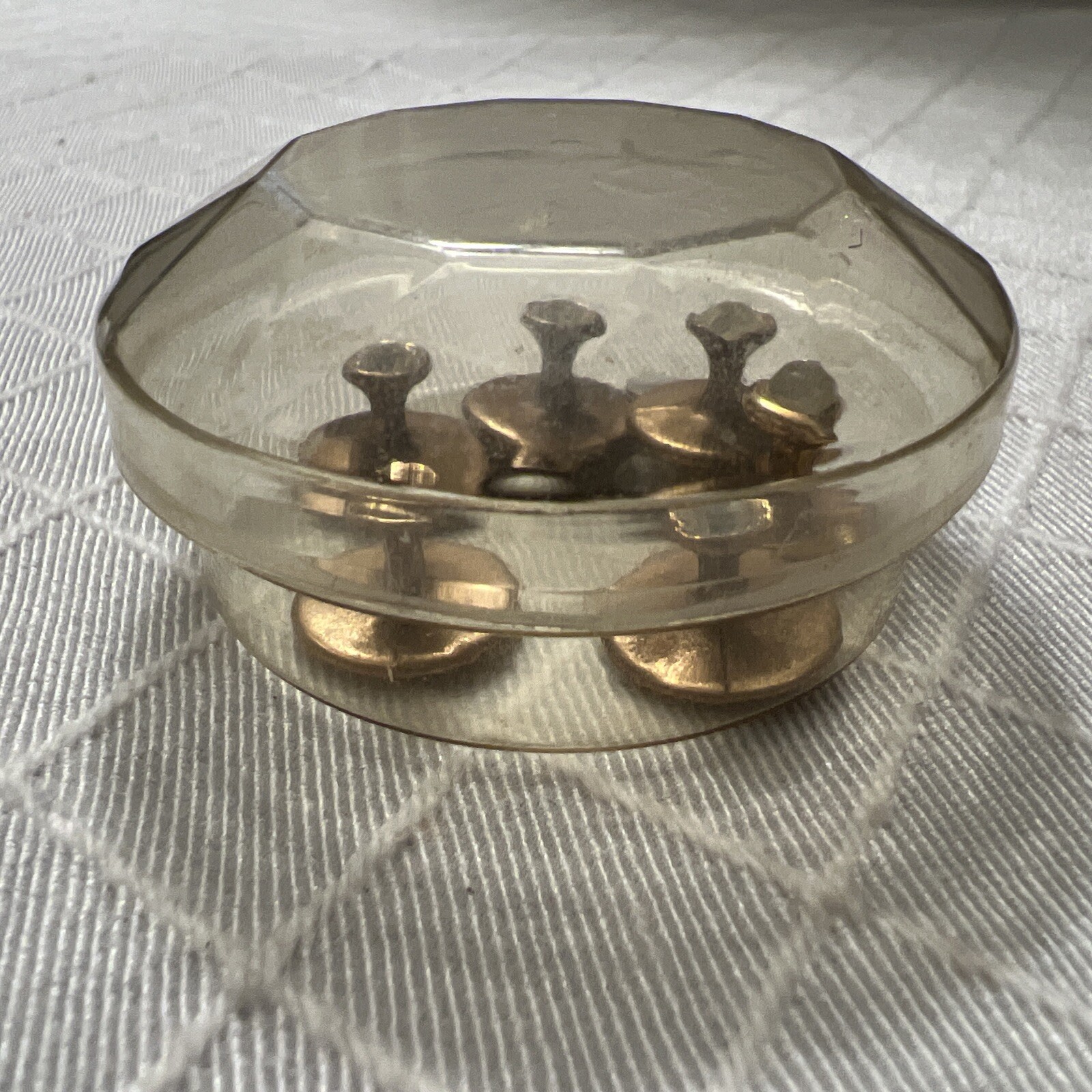This vintage jewelry set includes 8 tuxedo buttons and cuff links made of goldtone brass with white round rhinestones. The set also comes with 3 extra rhinestones. The cuff links and buttons are designed for men and have a classic style, making them suitable for formal occasions. The pieces are crafted from brass with rhinestones, giving them a luxurious and elegant appearance. Perfect for adding a touch of sophistication to any tuxedo ensemble.