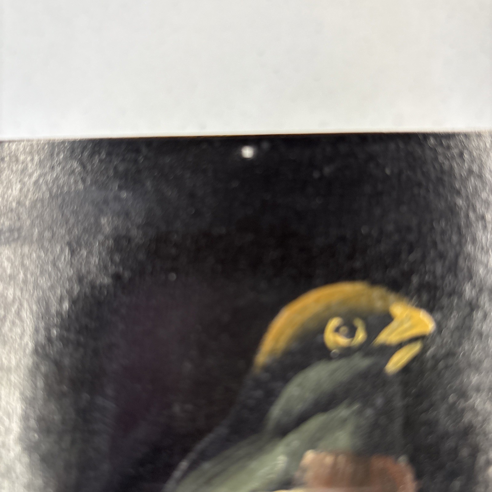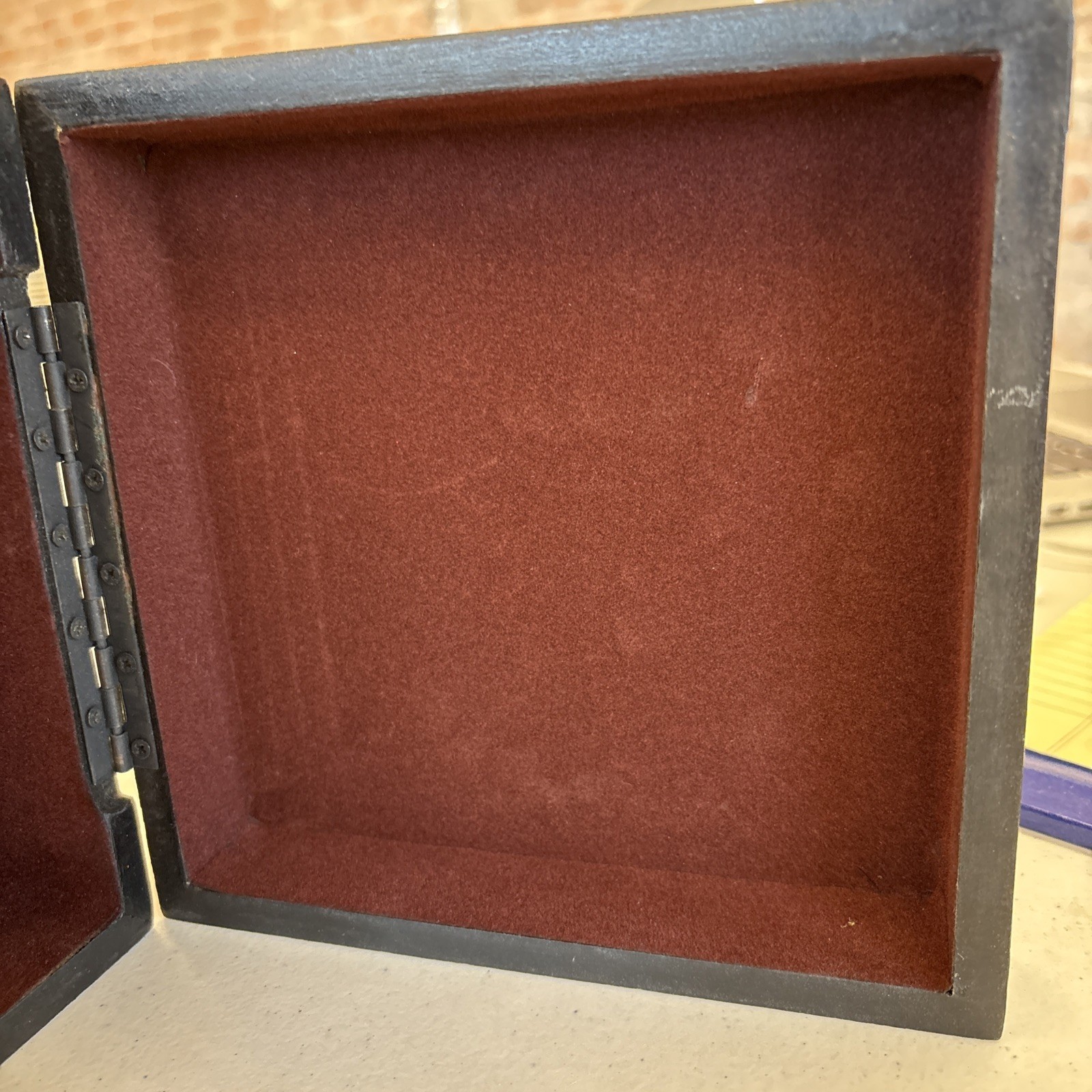 This medium-sized black jewelry box with a wood construction features intricate decoupage of birds and floral branches, giving it a beautiful and nature-inspired design. The hinged box has a stained finish, making it a unique and charming collectible item for adults. Measuring 7-1/8" in length and height, this keepsake box from China is perfect for storing small treasures and jewelry, adding a touch of elegance to any space with its nature-themed decor.