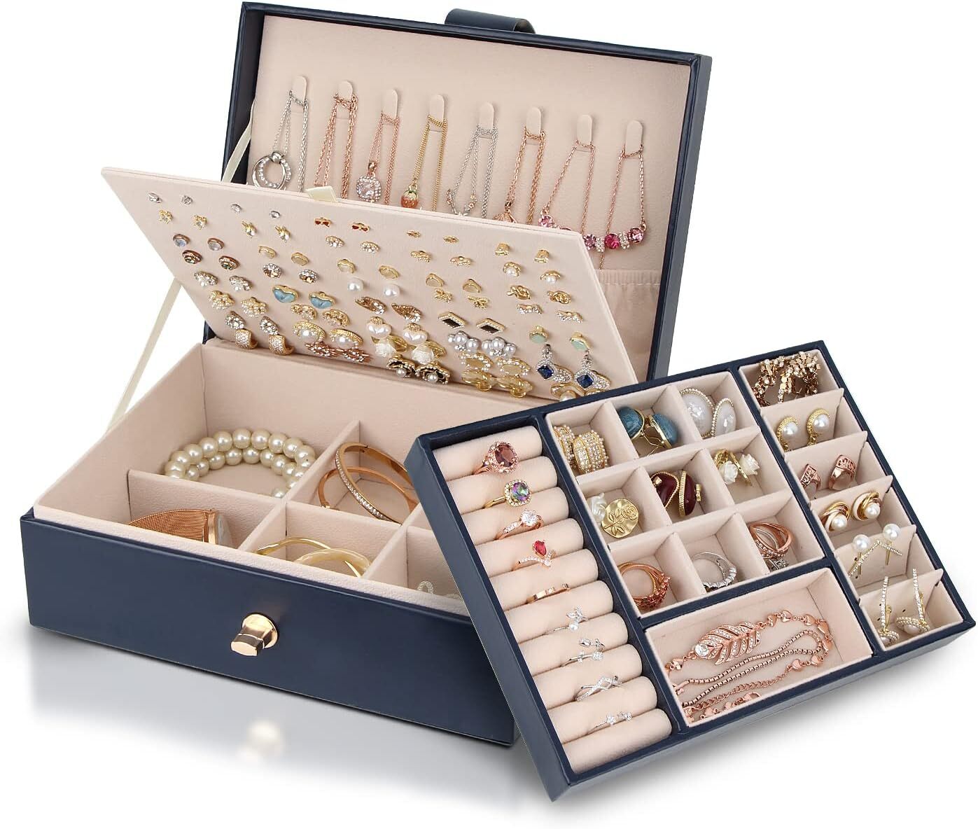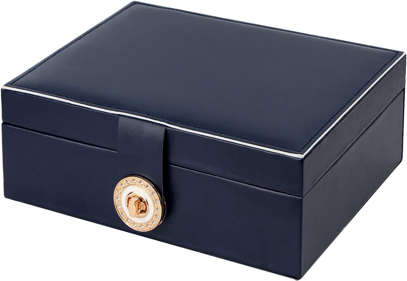 Jewelry Box for Women Girls, Large Organizer Storage 23*17*9 cm, Blue Product Details Color: Blue Brand: Yonzone Material: Faux Leather Style: Vintage Special Feature: Waterproof, Large, Adjustable, Lock Recommended Uses For Product: Ring Product Dimensions: 6.8"D x 9.1"W x 3.5"H Target Audience: Women, Men, Girls Shape: Rectangular Occasion: Mother's Day, Christmas, Wedding, Anniversary, Birthday Mounting Type: Table Top Finish Type: Polished Inner Material: Leather Closure Type: Zipper Number of Drawers: 1 Item Weight: 0.79 Kilograms Number of Compartments: 4 Jewelry Storage Type: Jewelry Case Number of Items: 1 Manufacturer: Yonzone Item Weight: 1.75 pounds Size: 23*17*9 cm Finish: Polished Item Package Quantity: 1 Special Features: Waterproof, Large, Adjustable, Lock Batteries Included?: No Batteries Required?: No Color: Blue Brand: Yonzone Material: Faux Leather Style: Vintage Special Feature: Waterproof, Large, Adjustable, Lock Recommended Uses For Product: Ring Product Dimensions: 6.8"D x 9.1"W x 3.5"H Target Audience: Women, Men, Girls Shape: Rectangular Occasion: Mother's Day, Christmas, Wedding, Anniversary, Birthday [Elegant and Luxurious Design]: This jewellery box features large storage, multi layers, high quality and elegant faux leather, odorless, waterproof and anti-abrasive. Interior anti-tarnish beaded flannel keeps your jewelry well against dust, fingerprints, scratches, damages. it is easily clean with a damp cloth. [Double Stackable Layer & Removable Partitions]: This jewellery case organizer comes with double stackable layer and removable compartments which create large capacity and different layout. This large jewelry boxes can meet different needs and keep all types of jewelry organized, neatly, beautifully displayed. You can visually see all of your precious belongs, makes selection easier. Glossy and exquisite metal clasp is easy to open and close. [3 Layers Large Capacity Jewellery Organizer]: Dimension: 9.1" x 6.8" x 3.5" inches, this jewellery case is designed with large capacity, which can contain a lot of jewelleries to meet daily use, saves lots space to make your room looking more neatly, this jewellery organiser is portable to put on your dresser, nightstand, bathroom counter or vanity. Multi layers and generous design goes easily with your decor. [Safety Lock and Premium Material]: Our jewellery storage case is made of high quality PU leather and soft velvet interior. This jewelry box with lock can keeps your jewelry from being lost and protects it from dust, fingerprints and scratches. Well made quality makes its durable for use. [Good Choice for Gift]: The jewellery case holder is good for women or girls. It is an idea gift for mother, wife, daughter or friend on Valentine's Day, Mother's day, Christmas, birthday, anniversary and so on.