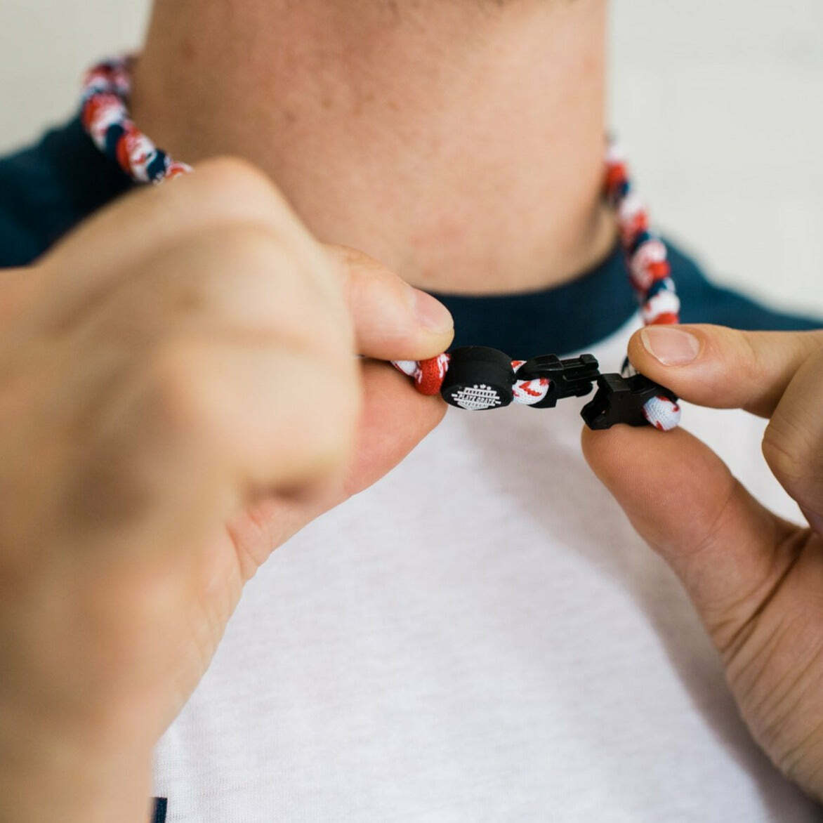 Tri-weave Plate Crate titanium necklace Colors include a red, blue, white with baseball seams. Recommended Positions: INFIELD OUTFIELD PITCHER CATCHER HITTER
