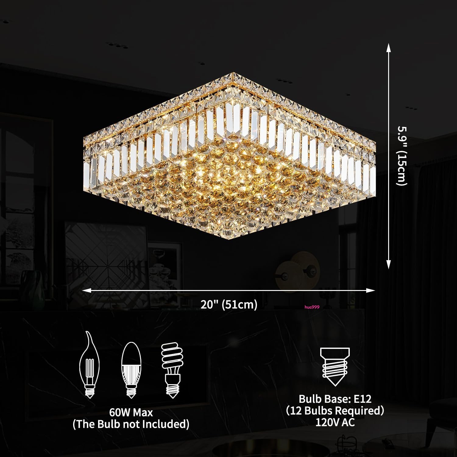 Features: ☀Elegant Looking : Made of K9 clear crystal design can reflect and refract light to reach exquisite and opulent effect. The stainless steel Gold Color frame with crystal beads,will capture and reflect the light effectively, look elegant and atmospheric. ☀Modern Base Design : Square Chandelier lampshade,consisting of numerous clear crystal beads and Gold steel frame, with 8/12/18 Lights holder, creating an elegant and luxurious atmosphere. Crystal ceiling light suits for Hallway, Living Room, Bedroom, Kids Room, Kitchen, Bar, Aisle, Hotel, Restaurant, Pass-way and more. ☀Standard Installation Level & Bulb : Input AC 120V, Max.60W each holder. Compatible with E12 bulbs (Warm white or Cool white Bulbs) The Crystal Chandelier have 12 Holder【Bulb is not included】 ☀Crystal Chandelier Size : diameter: 51cm / 20 inches. Height: 15cm / 5.9 inches. diameter 60cm / 24 inches. Height: 15cm / 5.9 inches. diameter 80cm / 31 inches. Height: 15cm / 5.9 inches. Please check the size of lighting fixtures before buying. Suggested Room Size: 8-35㎡ for one closet chandelier, If have any question please Write to Q&A Can be customised:Yes,we can customise this light,like rectangular or round or oval shade if you need,color also can be customised,size also can be customised. Payment About us Return and feedback Delivery time Pay attention Payment International Buyers – Please Note: a) Import duties, taxes and charges are not included in the item price or shipping charges. These charges are the buyer's responsibility. b) Please check with your country's customs office to determine what these additional costs will be prior to bidding/buying. About us We are pleased to offer the most up to date items at competitive prices. You can rely on us to deliver the most on demand products within short timescales. Return and feedback We hope you love our product but if for any reason you want to return it or you’re not fully satisfied with your new product, please contact only Via eBay Message ,please Do not open case or return or left negative and neutral feedback ,we can solve it happily by messaging. Delivery time 1.Items will be shipped to buyer's eBay registered address. Please confirm your eBay address before you make the payment. We don't accept to revise address after you make an order. 2.Items location is in China, due to geographical distance, please be advised that the international shipping usually take longer than domestic. 3.All lights come seperately,need to be assembled by buyer,we highly suggest to hire a electrician. Pay attention 1.please make sure you write correct address,we are not able to revise address after you make an order. 2.item maybe come with several packages,please message us if you only get part of them or something missing. 3.if there has accident,please do not open return or item not received case or left negative and neutral feedback before you contact only Via eBay Message ,we are glad to offer reasonable solution.