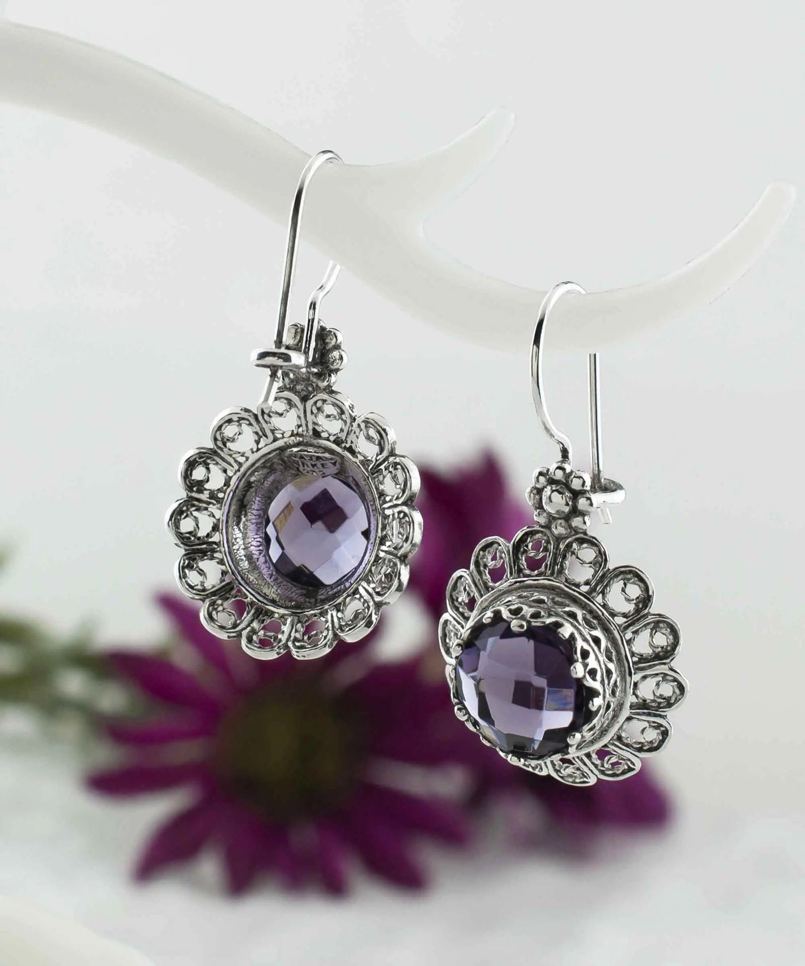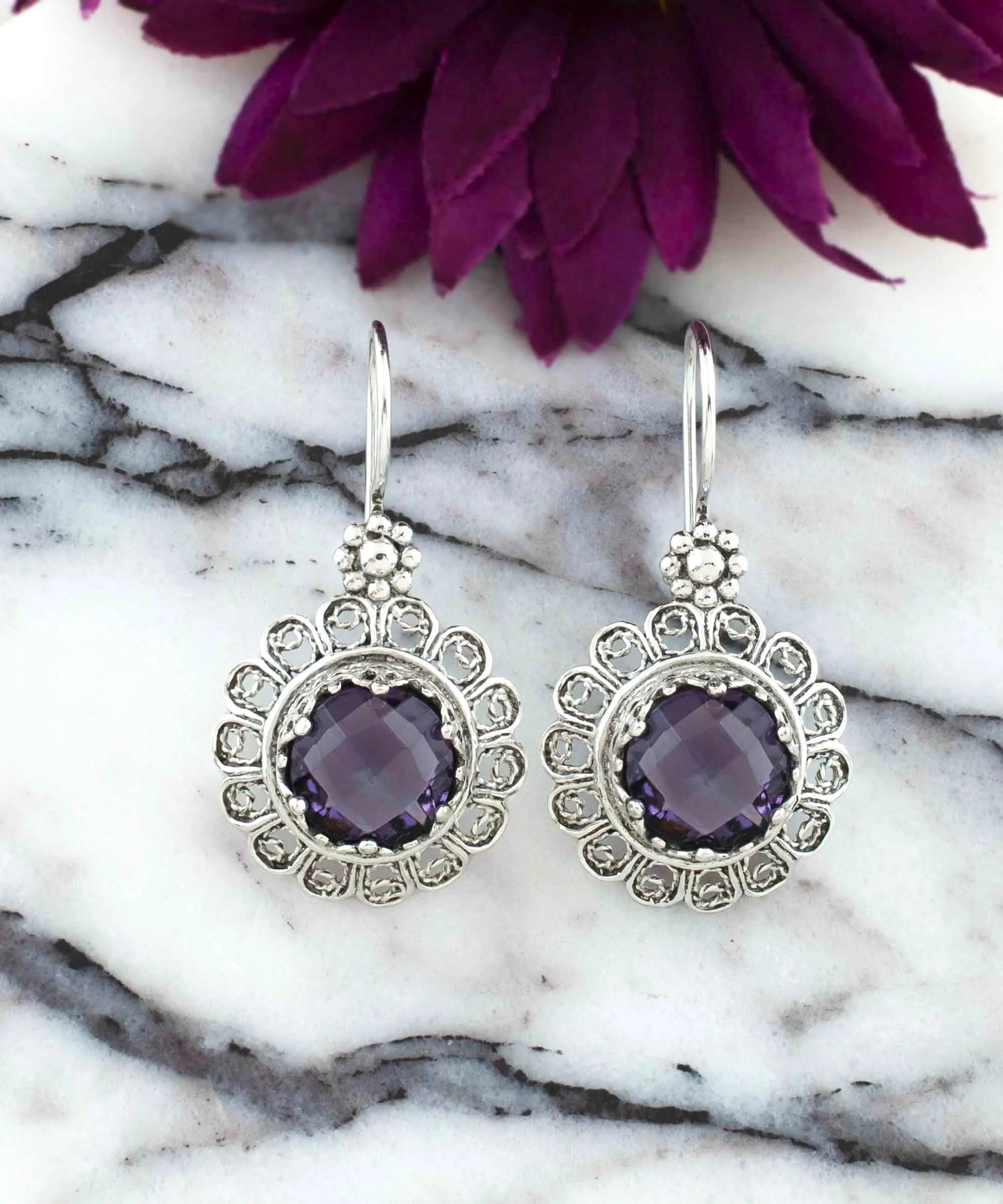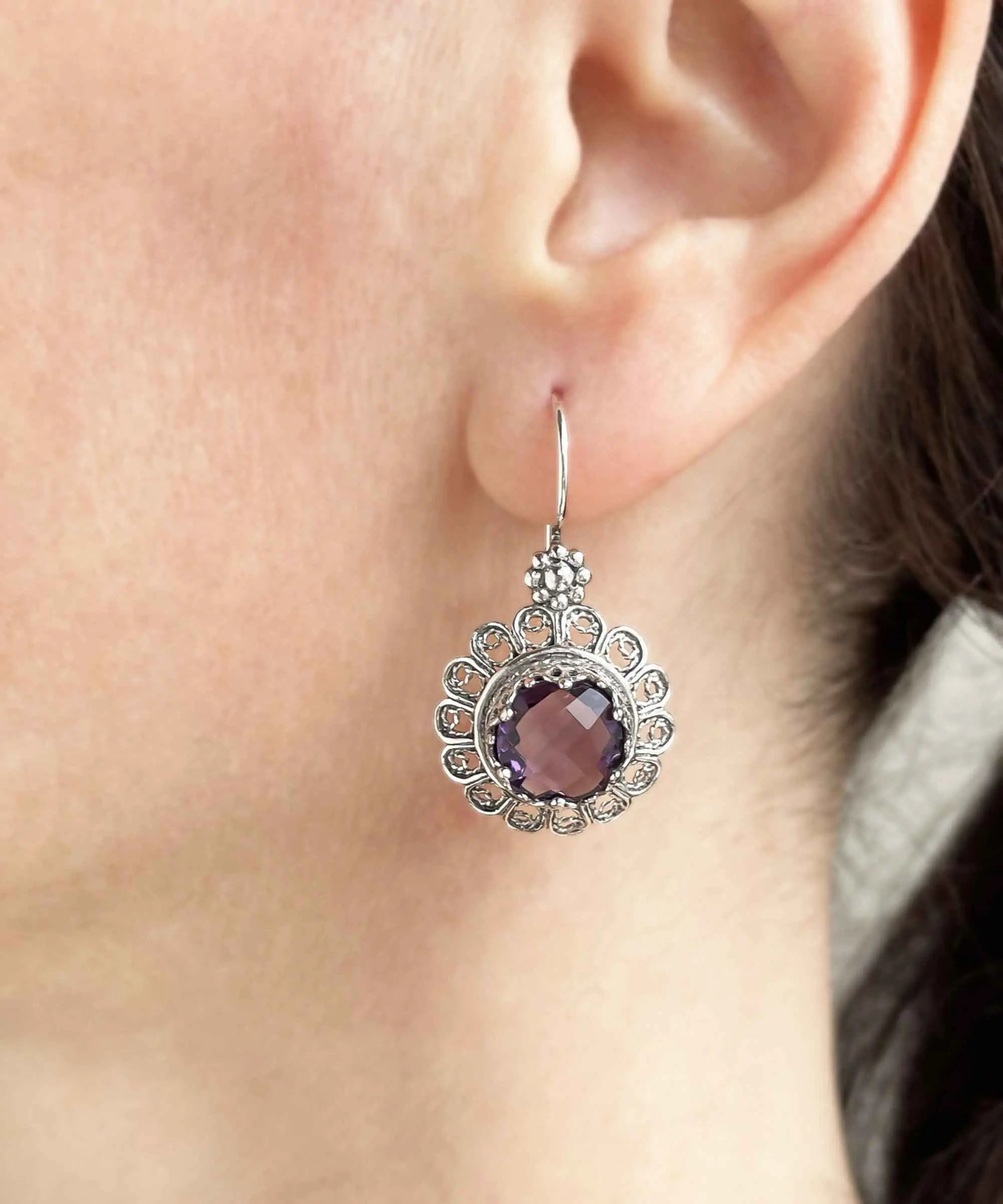 Looking for a stunning and meaningful gift option for your loved one? Our Handmade Filigree Art Flower Design Amethyst Gemstone Women's Sterling Silver Dangle Drop Earrings are the perfect choice. The intricate flower design is handcrafted by skilled artisans, creating a timeless and elegant piece that will add a touch of luxury to any outfit. These earrings are oxidized and highly polished to achieve a unique and sophisticated look. Measuring 1.50 inches in length and 0.75 inches in width, they are a statement piece that will turn heads and add a touch of glamour to any outfit. These earrings feature a beautiful 10 mm double side faceted round cut Amethyst gemstone, which is a February birthstone. The gemstone is securely set in sterling silver, adding an extra layer of durability to the design. The dangle drop style adds an extra element of movement and elegance, making these earrings perfect for any occasion. Crafted from premium quality sterling silver, these earrings are hypoallergenic and gentle on sensitive skin. They come with a silver polish cloth to help maintain their natural shine, and a luxurious gift box, making them the perfect gift option for Mother's Day, Valentine's Day, birthdays, anniversaries, or any other special occasion. With their unique flower design and stunning Amethyst gemstone, these earrings are sure to make a lasting impression. The high-quality craftsmanship and attention to detail make them a truly special gift option. Order yours today and give your loved one a gift that will be treasured for a lifetime.