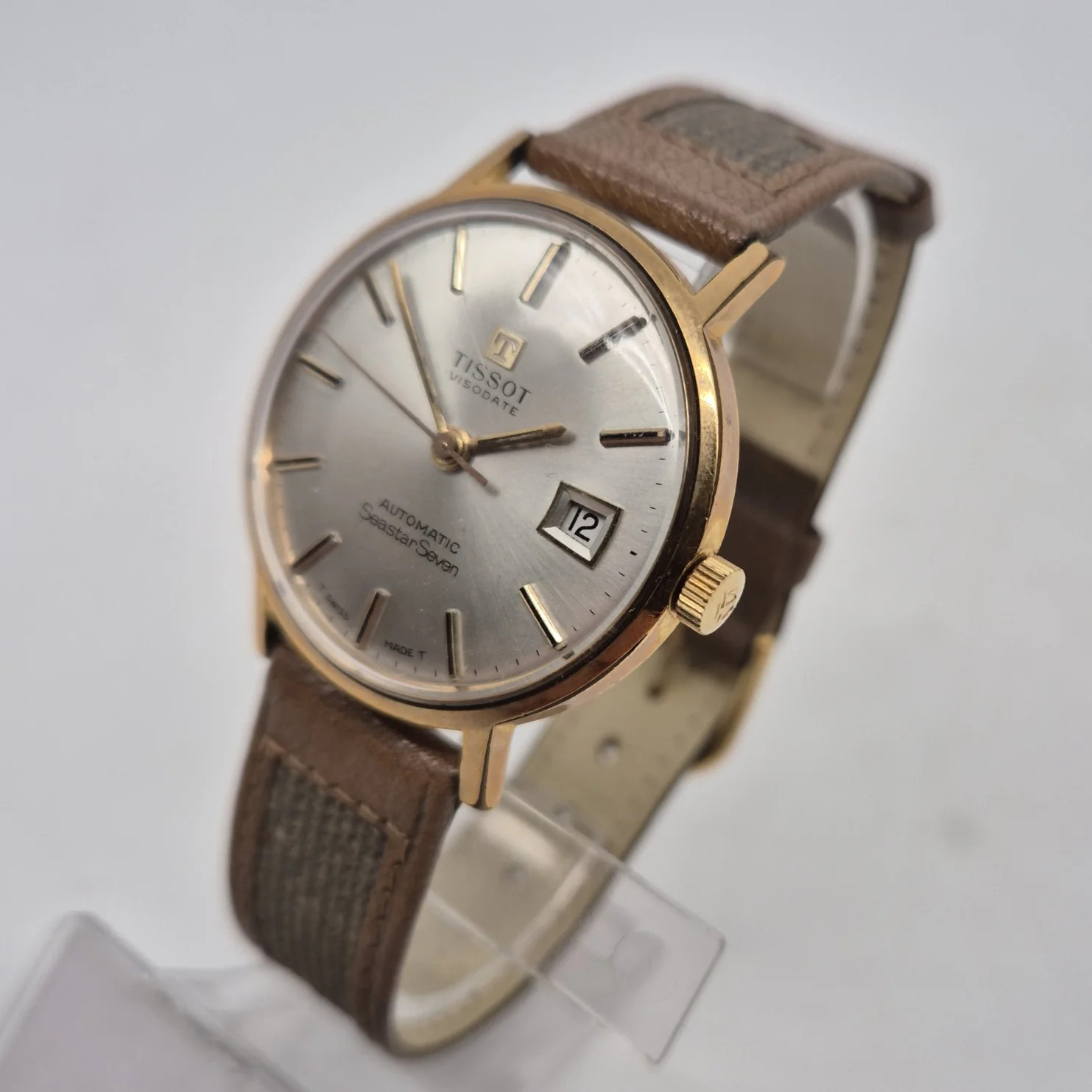 Diese Tissot Visodate Automatic "Seastar Seven" vereint ein zeitloses Design mit Schweizer Präzision. Das silberne Zifferblatt mit goldfarbenen Akzenten wird durch ein robustes Gehäuse in vergoldetem Edelstahl und ein stilvolles, braunes Lederarmband ergänzt. Ein ideales Sammlerstück für Liebhaber klassischer Uhren. Details: Marke: Tissot Artikelnummer: FES0332 Zustand: Gebraucht Material: Vergoldeter Edelstahl Herkunft: Schweiz Funktionen: Automatikwerk, Datumsanzeige Gewicht: Ca. 75 g Besondere Merkmale: Klassisches Design mit vergoldeten Akzenten Automatikwerk für zuverlässige Präzision Wasserfestes Gehäuse mit graviertem Boden