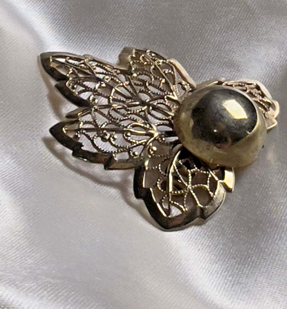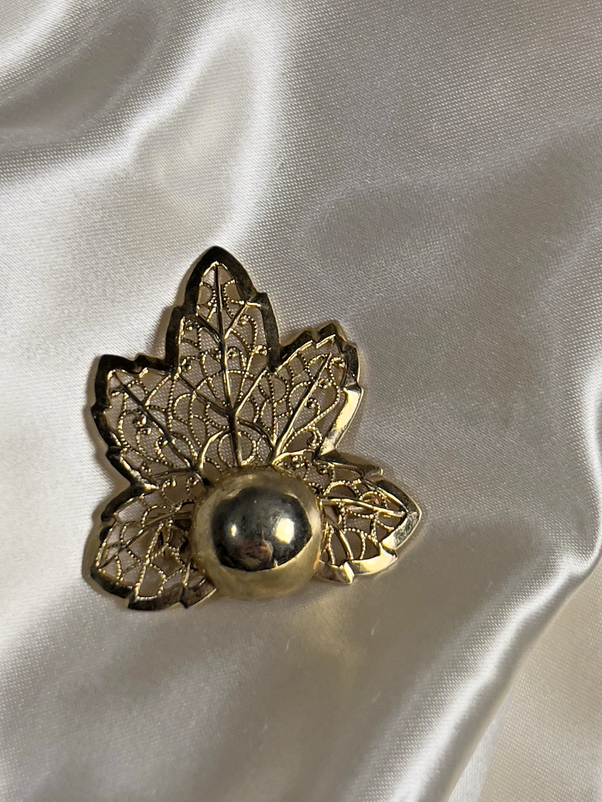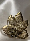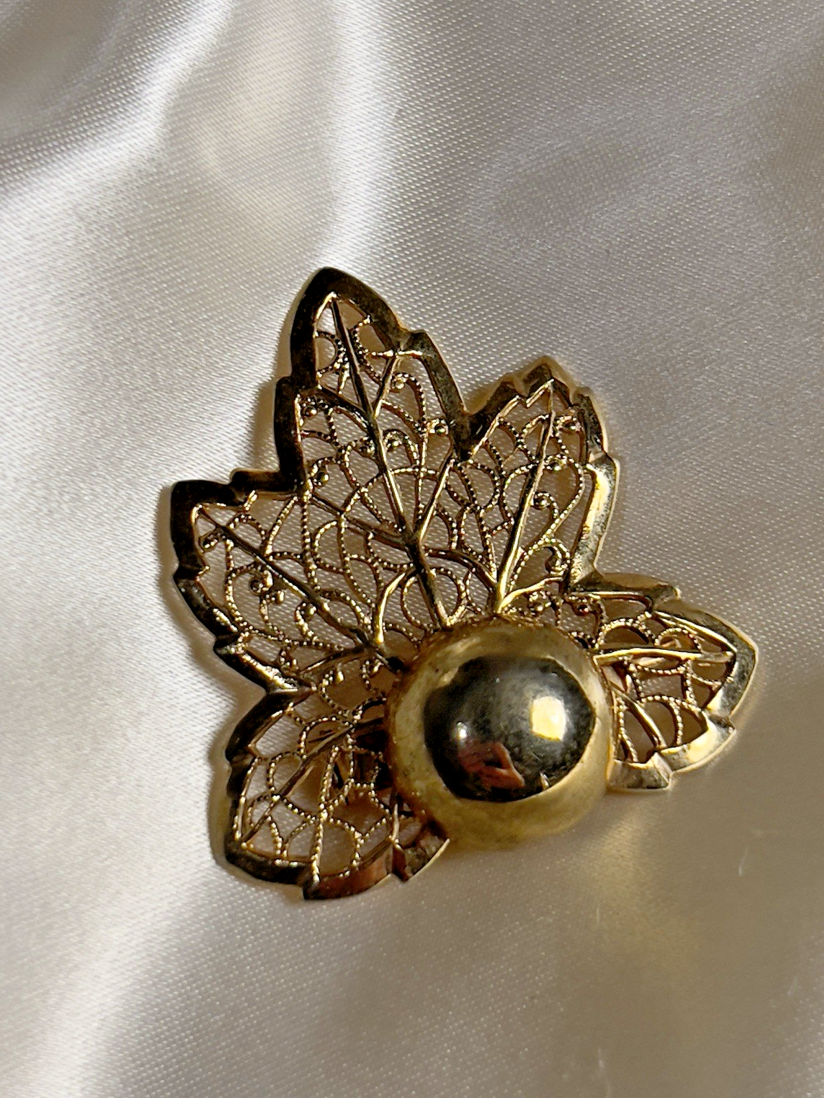 This striking vintage brooch features a sculpted gold-tone leaf with delicate openwork filigree and a bold central dome, creating a beautiful mix of texture and shine. Lightweight yet eye-catching, it captures the natural elegance of mid-century costume jewelry. Era & Inspiration Leaf motifs were a favorite in 1950s–60s fashion, symbolizing growth and timeless beauty. The intricate filigree design reflects the craftsmanship of that era, when detailed metalwork became a statement of affordable luxury. Styling Tips Pin it to a blazer lapel, sweater, scarf, or handbag for a warm autumn accent or year-round vintage sparkle. Pairs perfectly with other gold accessories for a chic, coordinated look.