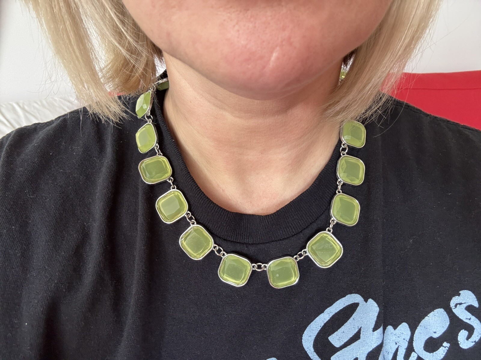 This beautiful necklace is a perfect statement piece for any outfit. The striking green color is sure to draw attention and add a pop of color to your wardrobe. The necklace is designed with a unique style that is both elegant and eye-catching. It is made with high-quality materials to ensure durability and longevity. The necklace is perfect for any occasion, whether you're dressing up for a night out or adding a touch of glamour to your everyday look. It is a great accessory for any jewelry collection and is sure to become a staple in your wardrobe. This necklace is a must-have for any fashion-forward woman who wants to make a statement with her jewelry.