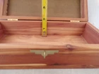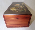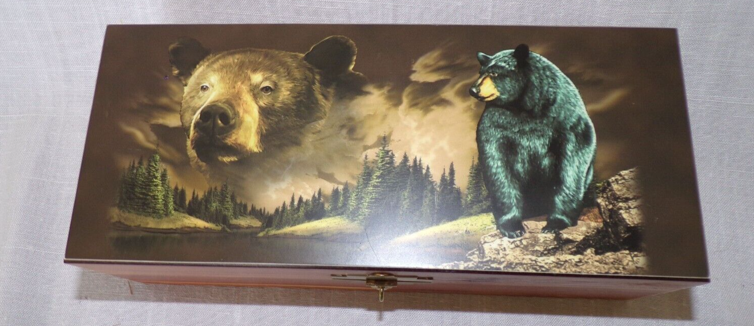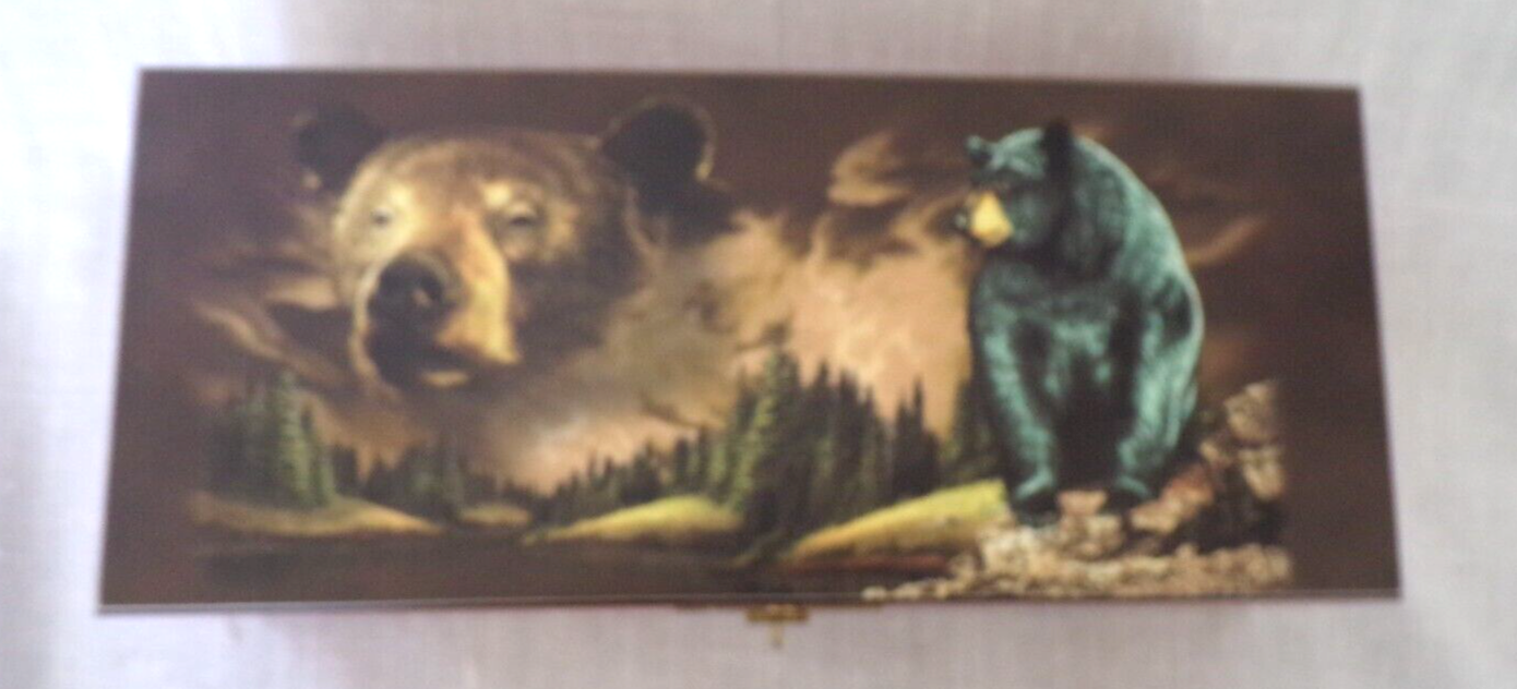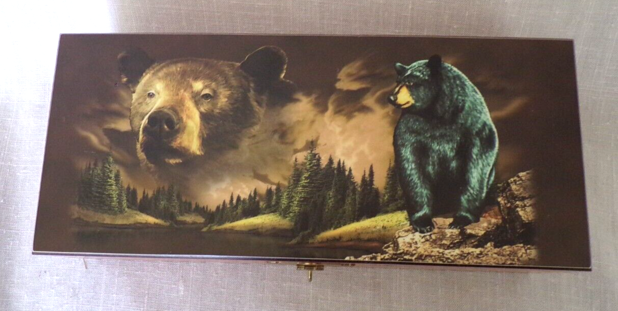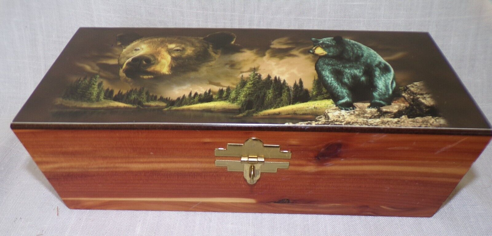 JEWELRY BOX, KEEPSAKE, DECOR WOOD CEDAR BOX, BEARS. Has light scratches, 2 dings on top, Worse ding shown in last picture.(to the left and bottom of ear Measures approx. 9.25" "'x2" x1/8"