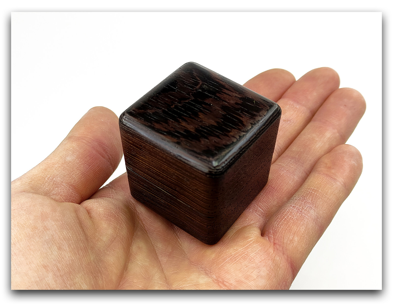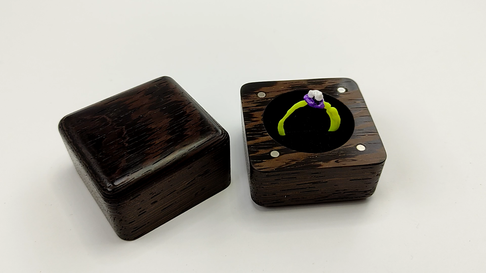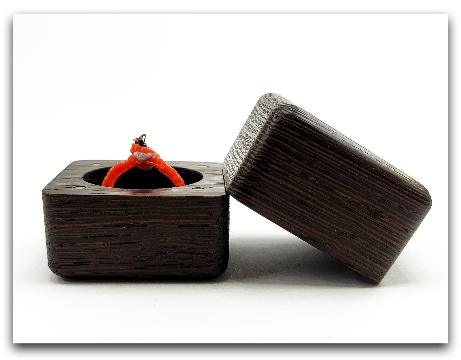 This proposals ring box made from high-quality wenge wood and designed to keep your ring safe and secure, This wooden ring holder perfectly sanded by hand and finished with ecological oil and wax to reveal natural beauty of wood. By default, the box is equipped with a BLACK pillow to hold the ring, but if you want RED, BLUE, YELLOW or moss (different colors) please write to me. The box can be engraved with your names, initials, text or picture and will be great personalized gift. SIZE: high - 42 mm. wide - 42 mm . deep - 42 mm . Inside diameter of 30 mm. Ring height max – 35 mm. Laser engraving +4$