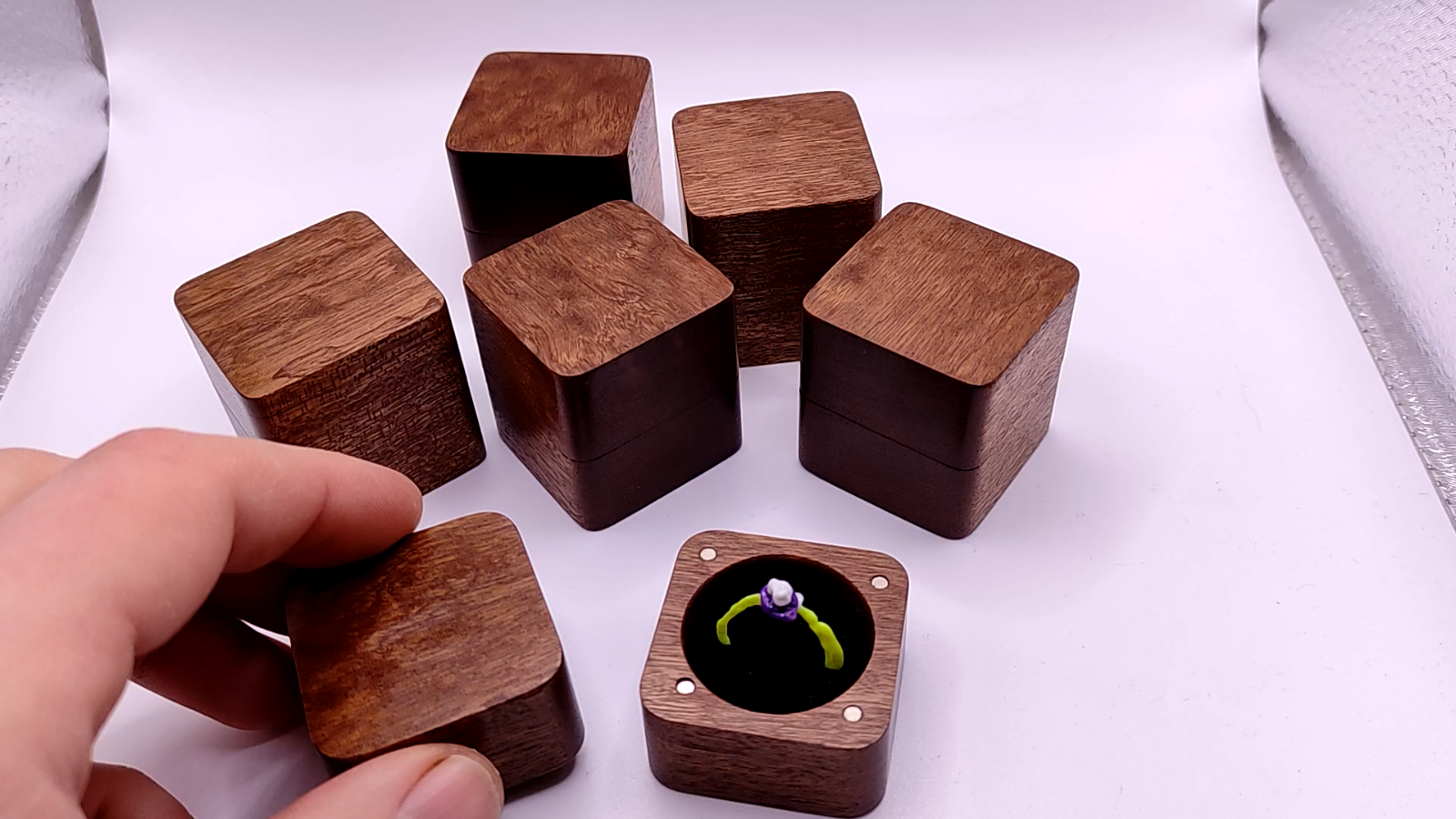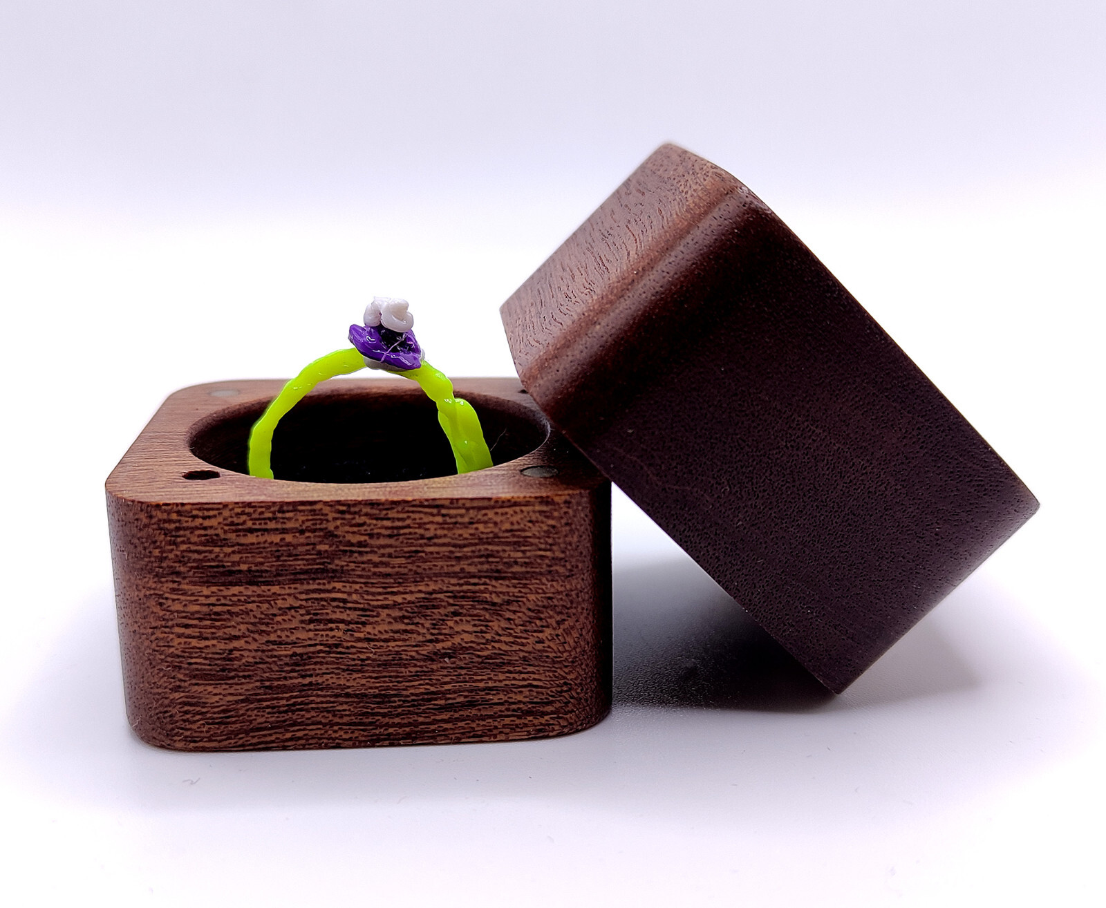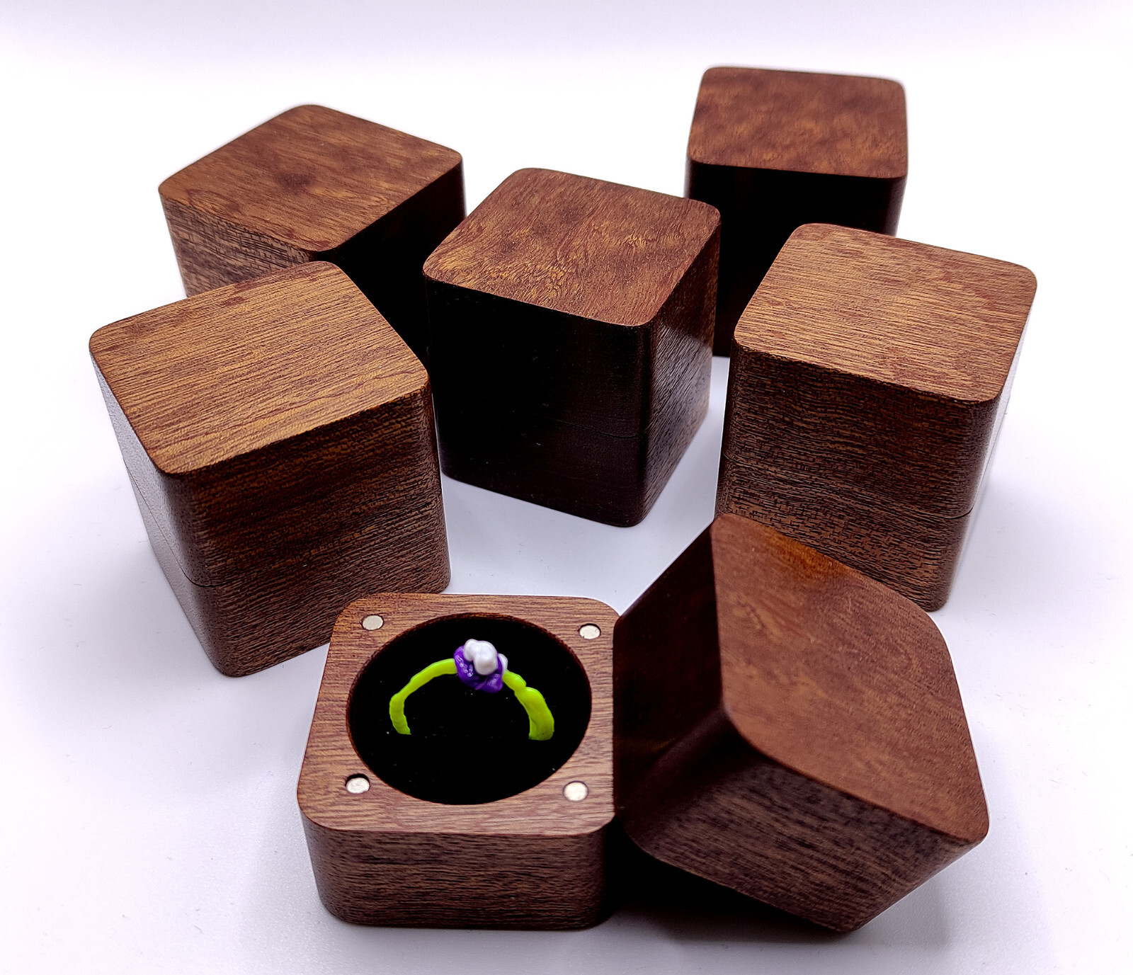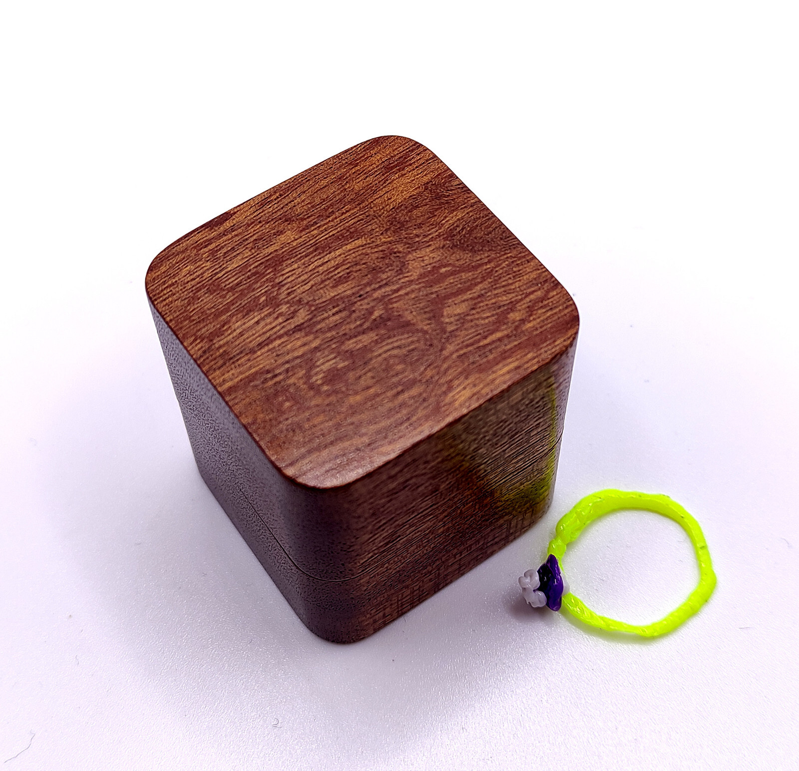 This simple wood engagement ring box is made from sapelli wood, carefully sanded and polished with wax. Very pleasant lies in the hand. The box can be engraved with your names, initials, text or picture and will be great personalized gift. The lid is held firmly by magnets at the four corners. Will not open in pocket. The ring is in a black suede cushion. Other colors of pillows are available as well as moss. The maximum height of the ring is 35 mm. Boxes are ready to ship. I will ship on the day of purchase, if you need engraving then +1 day. (I send you an engraving layout for approval) I can make a pillow with slots for 2 rings. Size: high - 40 mm. (1.6") wide - 40 mm. (1.6") deep - 40 mm. (1.6") inside diameter of 30 mm. (1.2") Ring height max – 35mm. (1.4") Laser engraving +4$