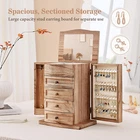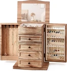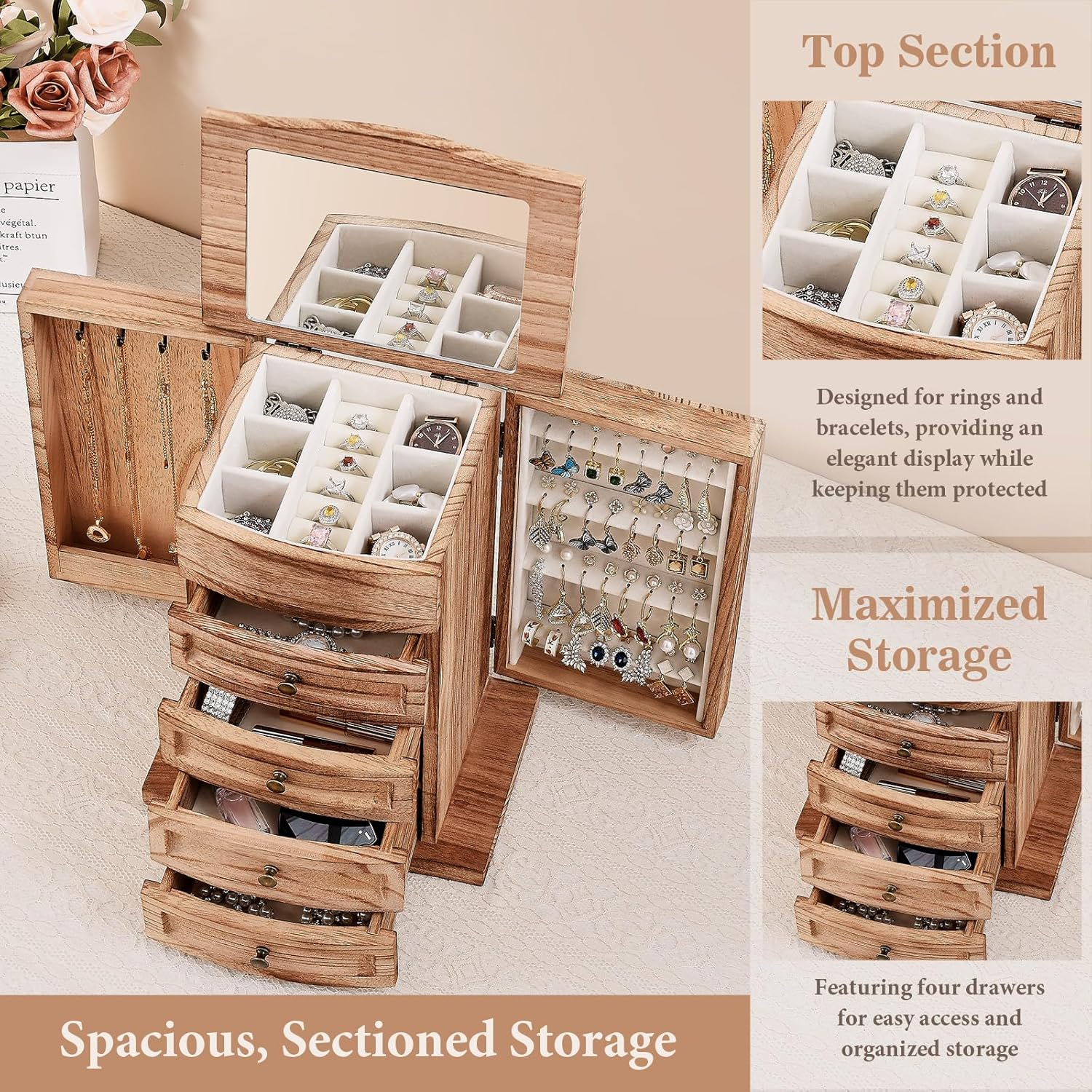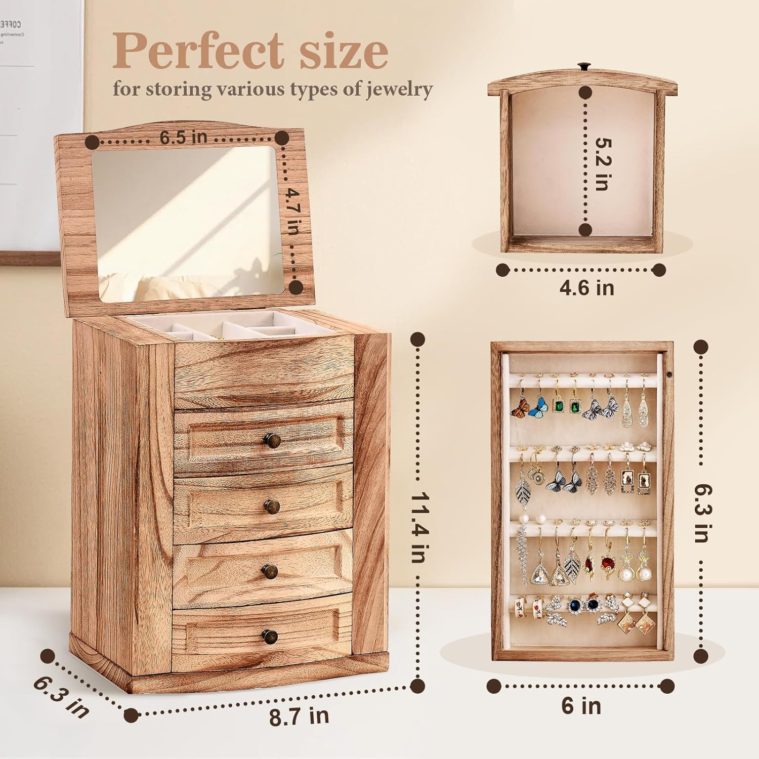 【Practical Jewelry Box】 Tired of misplacing or tangling your jewels? Poyilooo jewelry box offers a thoughtful solution to keep your jewelry organizers and storage. With its side doors storage room and 5 layer drawers, it provides designated storage for earrings, bangles, rings, and other jewelry. The top layer has compartments for the rings, pins and brooches to store different jewelry Have 4 drawers to store such as bangles, bracelets, watches, lipsticks, and other jewelry accessories 【Rustic Wooden Jewelry Box】This wooden jewelry box is a awesome gift for the anyone who loves nature-inspired design and farmhouse style. Crafted from solid wood and finished in a rich, carbonized tone that highlights the natural grain, the piece boasts a rustic elegance that complements any bedroom or vanity. More than just storage, this jewelry box transforms your precious gems into a beautiful, eye-catching display 【Think Deeper, Design Better】Our wooden jewelry box not only provides ample storage and organizer, but also features a thoughtful built-in mirror on the lid. This allows you to easily view your reflection while accessorizing, saving time in your precious morning time 【Multi functional Structure】With two sides door for necklace and earring organizer, our wooden jewelry box goes beyond basic storage, keep your neacklace and earrings tangle and accessible. The left door includes four hooks perfect for hanging necklaces or bracelets. The right door with soft velvet lining for the earring organizer, 4 tiers holder boards to storage stud earring and earrings. This design provides a comprehensive solution to elegantly display and protect your entire jewelry assortment 【Perfect Gift for Her】Ideal Size 8.66"x 6.42"x 11.42" for Gift. Poyilooo exquisite wooden jewelry organizer makes an exceptional gift for the special woman in your life as a Birthday, Mother's Day Christmas Gift, or so on. Crafted with meticulous attention to detail, a carbonized finish that beautifully showcases the natural wood grain. From the built-in full-size mirror to the well-organized compartments and hanging storage, every element has been thoughtfully considered to provide a comprehensive jewelry valet that will keep her collection pristine and on display Product Description