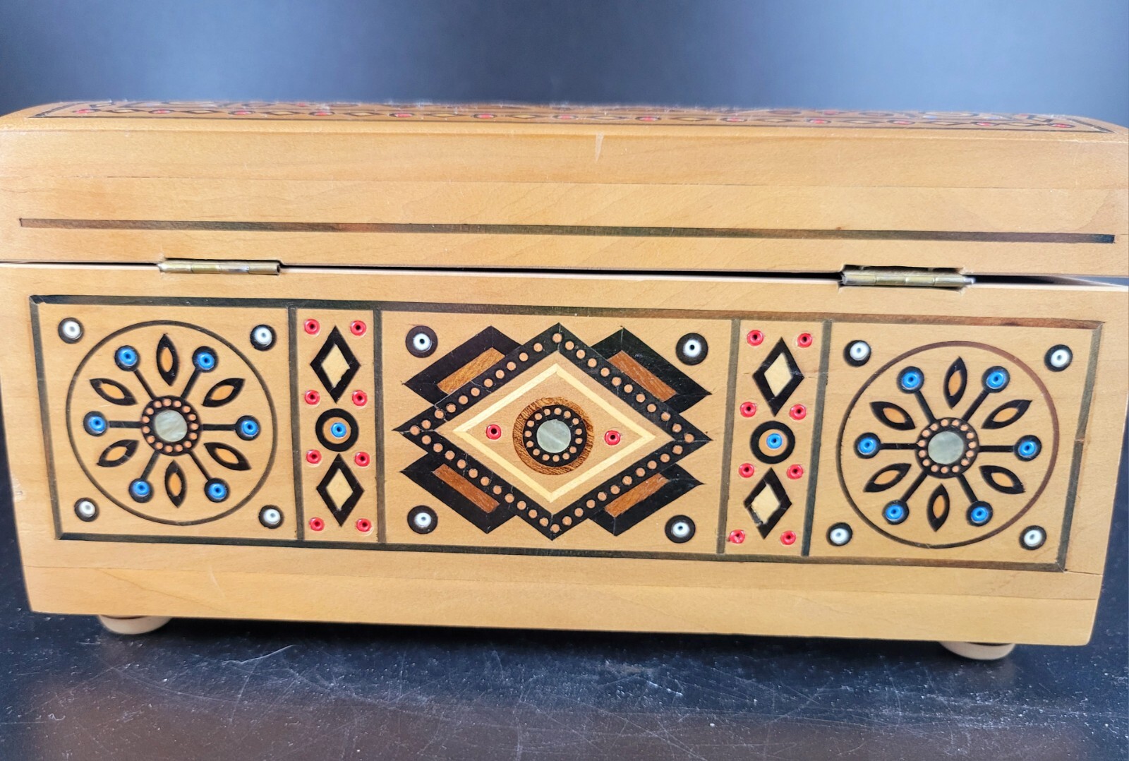 This charming jewelry box is a beautiful addition to any collection, perfect for storing your most treasured pieces. Crafted from high-quality wood and adorned with delicate mother of pearl artwork, this rectangular box features a handmade design that exudes a vintage charm. Measuring 4 inches deep and 8 inches wide, 3.5in tall, it is the perfect size for storing your favorite jewelry pieces. Whether you are looking for a functional storage solution or a unique decor piece, this jewelry box is sure to impress.
