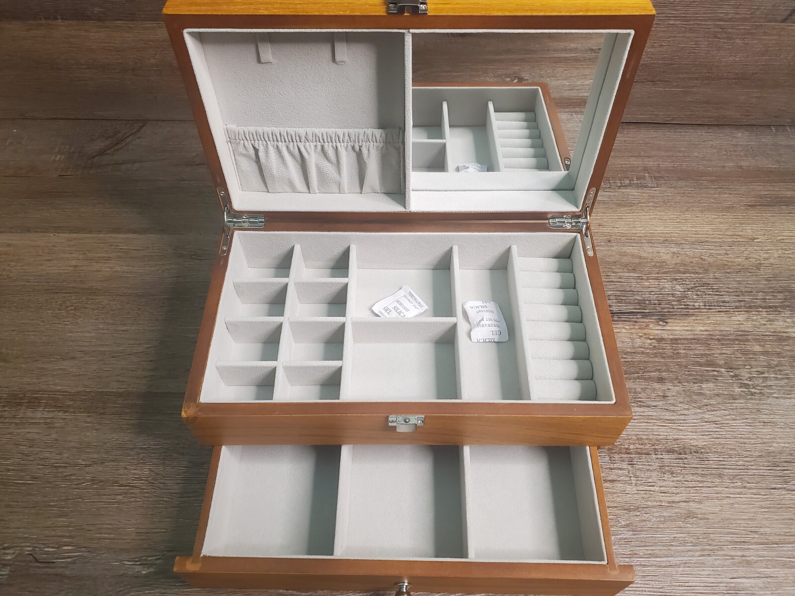 Jewelry Box Wooden One Drawer with Mirror Lining Ring Holder & Pouch Yellow Wood.