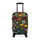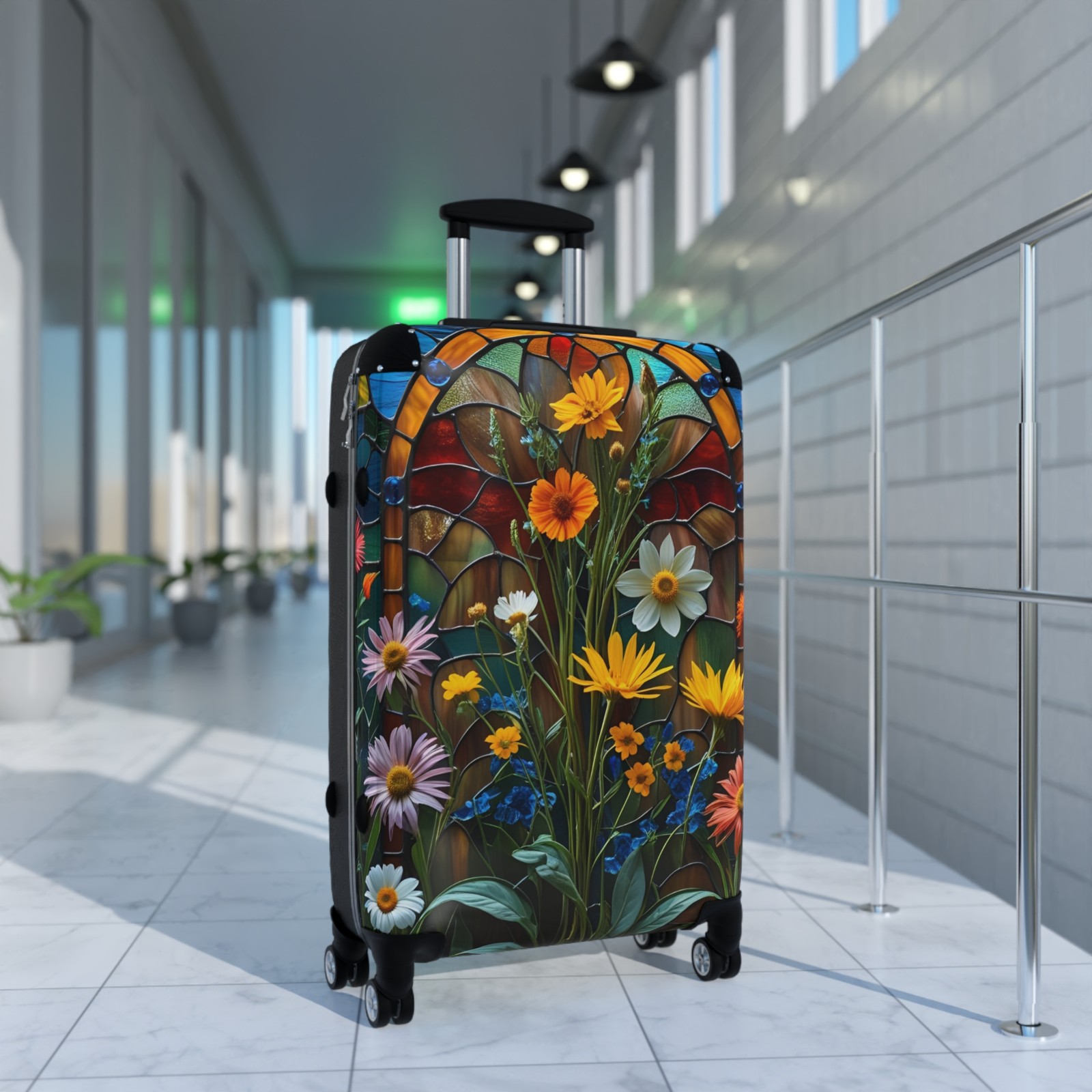Small Medium Large Height (with wheels), in 22.00 26.00 30.00 Length, in 9.00 10.00 11.00 Width, in 14.00 18.00 20.00 Handle Length, in 15.00 18.50 22.00 Suitcase. Stainglass, elegant unique, wildflowers print. Traveling is best done in style, and suitcases help anyone do exactly that. Available in multiple sizes to accommodate your needs, they come with an adjustable handle, 360-degree swivel wheels, a safety lock, and an adjustable handle for carefree movement through airports and cities. To achieve high-resolution designs, prints go on a canvas surface that is encapsulated in the PC shell. Please note: The print may slightly crease near the suitcase's edges. .: Material: polycarbonate front and ABS back hard-shell .: Adjustable telescopic handle .: Removable inner lining under a black rubber seal .: Two inner pockets .: Four double-wheels with 360° swivel .: Built-in lock