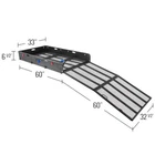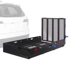 Get the functionality of a trailer with the convenience of a hitch mounted basket with the Elevate Outdoor Heavy-Duty Cargo Carrier with Ramp. A staggering 60 x 30" basket, lined with durable expanded mesh steel, is perfect for hauling up to 500 lbs. of equipment and loading wheeled devices is a breeze, thanks to an extra-long folding ramp. To make it even more convenient, the entire carrier folds up against your vehicle while you're in between loads, making one-way trips or round trip adventures as easy as can be. Manufactured from durable, powder-coated steel 500 lb. weight capacity Outer basket measures 60" L x 33" W x 6.5" H; inner basket measures 59.5" L x 32.5" W Ramp measures 60" L x 32.5" W and folds flat for easy storage Designed for Class III or IV 2" hitch receivers When not in use, carrier folds up against vehicle for easy transport Includes an anti-rattle device and 5/8" hitch pin Usage Guidelines Please note, hitch-mounted carriers are not recommended for use on RVs, motorhomes, or tow-behind trailers including 5th wheel and camping trailers. Never exceed the maximum tongue rating of your trailer hitch and be aware that your hauling weight may be limited by your vehicle's suspension. Some vehicles may require air shocks or heavier springs to stiffen up the suspension and prevent sagging. Carriers are not recommended for hitches less than 12" from the ground to the bottom of the hitch. Length: 60" Width: 33" Height: 6-1/2" Weight: 164 lbs. Ramp Length: 60" Ramp Width: 32-1/2" Hitch Class: III or IV Hitch Size: 2" Maximum Capacity: 500 lbs. Material: Steel