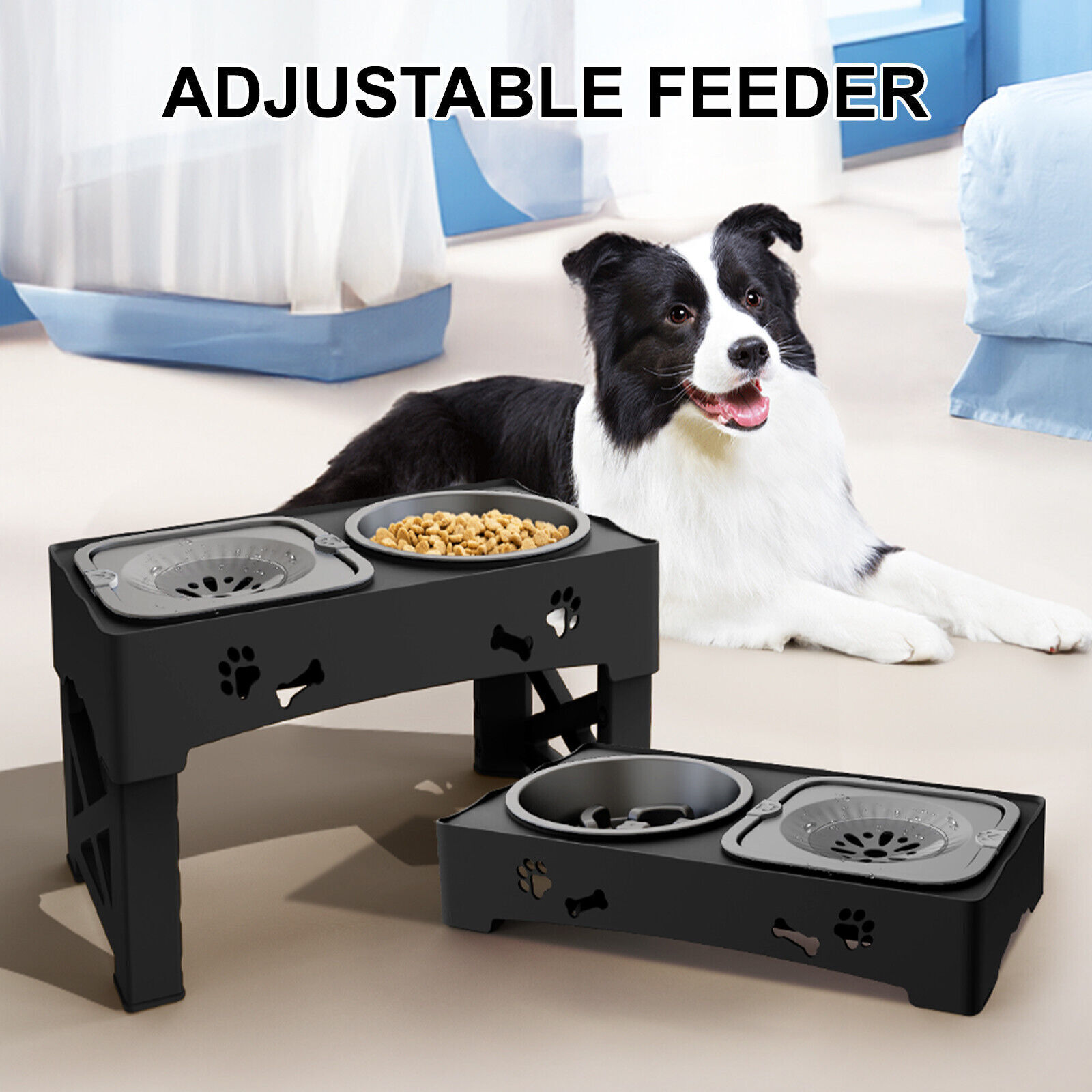 About this item 4 Height for All Life Stages: This 3-in-1 elevated dog bowl can be adjusted to four different heights of 4 inches, 9 inches, 10.6 inches, and 12.2 inches to accompany the dog from puppy to senior dog growth. The bottom of the dog water bowl is equipped with anti-slip pads to make it more stable and can withstand prolonged use. Innovative One-button Stretch: Compared with other styles of bowls, our bowl can be easily adjusted to a convenient height for your dog to eat by simply pressing the button on the bottom of the bowl holder. The elevated bowl helps to reduce pressure on your dog's neck and relieve joint pain, allowing your dog to eat healthily Slow Feeder Bowl and plastic Dog Bowl: Bring a plastic dog bowl and slow food dog bowl, The unique slow food dog bowl has an oval pattern ridge, which can effectively slow down the eating speed, and extend the pet's eating time. High-quality plastic bowls will not be corroded by the dog's saliva, very sturdy and easy to clean. No Spill Dog Water Bowl: The 50oz capacity no splash water bowl is designed with a floating disk and a fixed border, which can slow down the pet's drinking speed, so as to avoid choking and splashing, but also to keep pet hair dry and not wet chin, minimizing potential confusion. (Note: It is recommended to clean the floating disk at least twice a week and not recommended for microwave use) Easy to Install & Removable: The adjustable raised dog bowls are foldable for storage. Easily assembled in seconds without any tools, easy to store and carry, whether used indoors or taken on a camping trip, and can help you save space. Slow food bowl is suitable for large dogs, other bowls are suitable for small and medium dogs for your alternative choice. Another new slow food bowl with a shallower and wider design for small and medium sizes will be available for customers to choose in about a month, you can patiently continue to pay attention to our brand. At the same time, larger water bowl will also be available for customers's special needs.