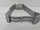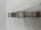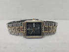 This Elgin Lady Elgin wristwatch features a gold and silver stainless steel case with a black dial. It has a square shape and a quartz movement made in Japan. The band is multicolor stainless steel. The watch is water-resistant and has a 12-hour dial. It comes without papers or original packaging and requires a new battery.
