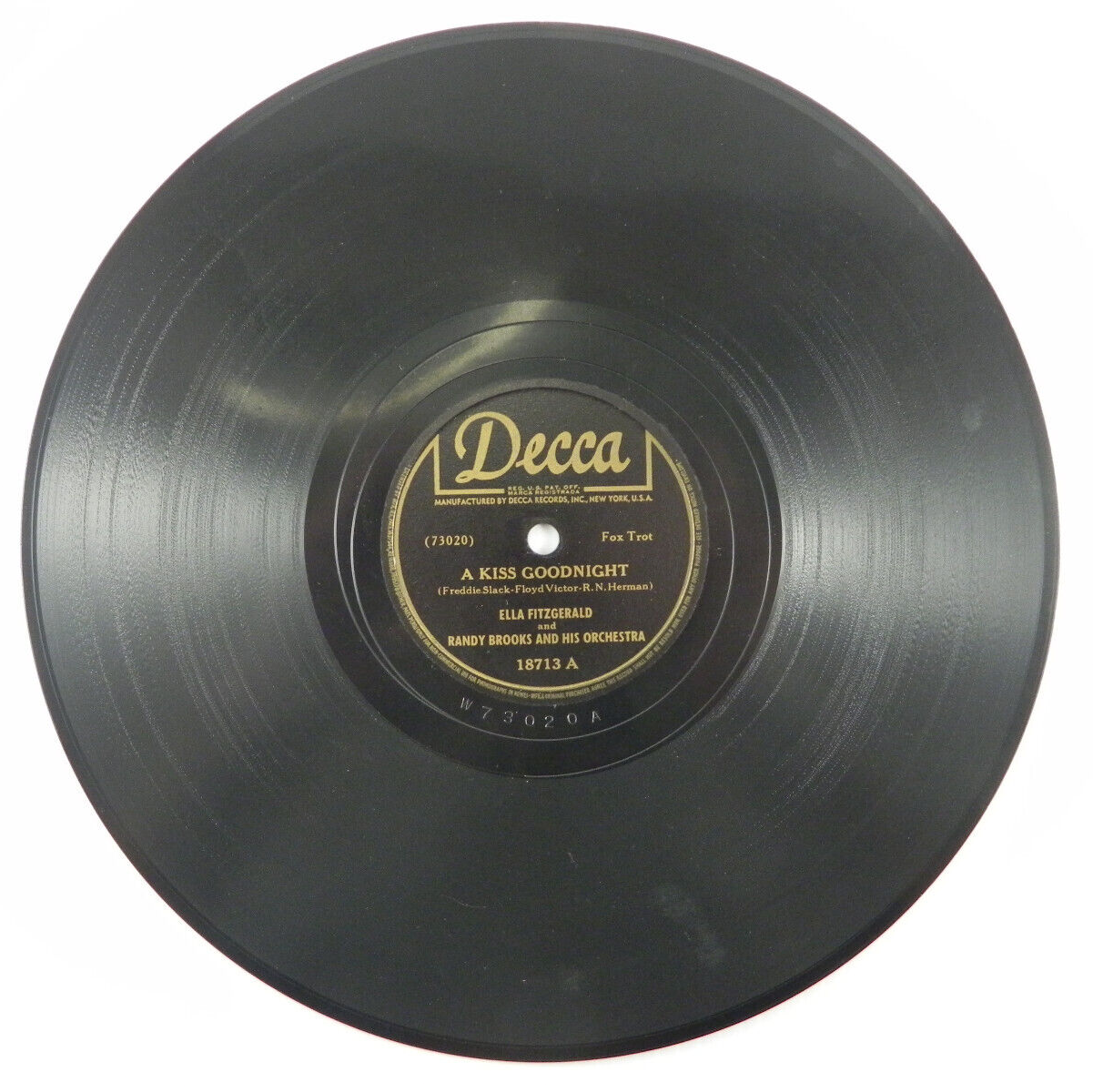 Ella Fitzgerald "A Kiss Goodnight / Benny's Coming Home On Saturday" 1945 Decca Play graded - fully tested. Condition: E- ; still shiny but without the lustre of a new record, few light scratches. Some surface noise. Label: Decca – 18713 Format: Shellac, 10", 78 RPM Country: US Released: Sep 1945 Genre: Jazz, Pop Style: Vocal For shipping: Records are cleaned and placed in a sleeve, and then into a plastic bag for protection against moisture. Then two cardboard squares are placed on each side of the records, making a sandwich, then taped together. Next, two layers of bubble wrap around the record sandwich. Using a 14x14x4 (or similar) box depending on the number of discs, more bubble wrap is placed on the bottom of the box, and then the record sandwich on top, adding more bubble wrap above that. The empty spaces are filled with packing peanuts or similar and the box sealed. Reduced shipping available when purchasing multiple records! See many more similar records in our store!