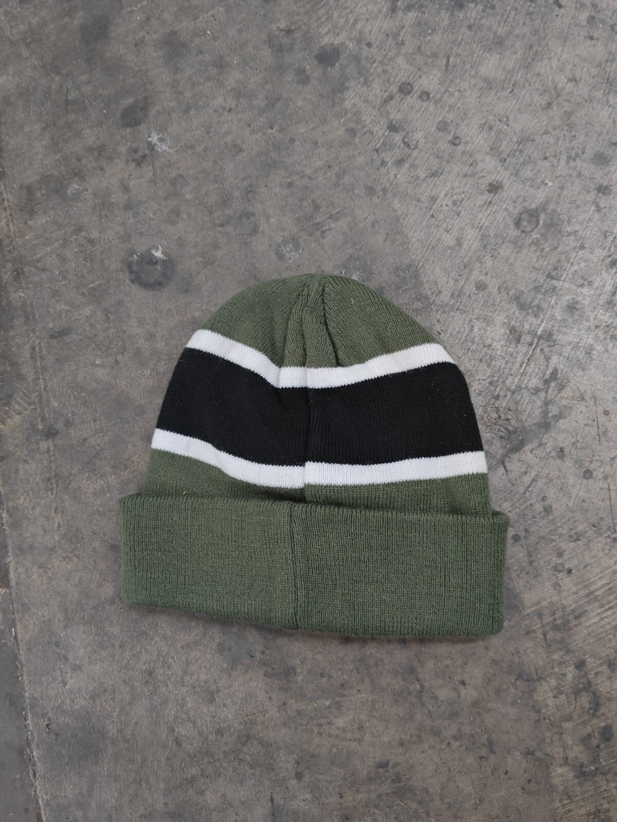 beanie hat California Republic grizzly Bear flag embroidered. Warm knit material has stretch to fit comfortably olive green black and white stripe.