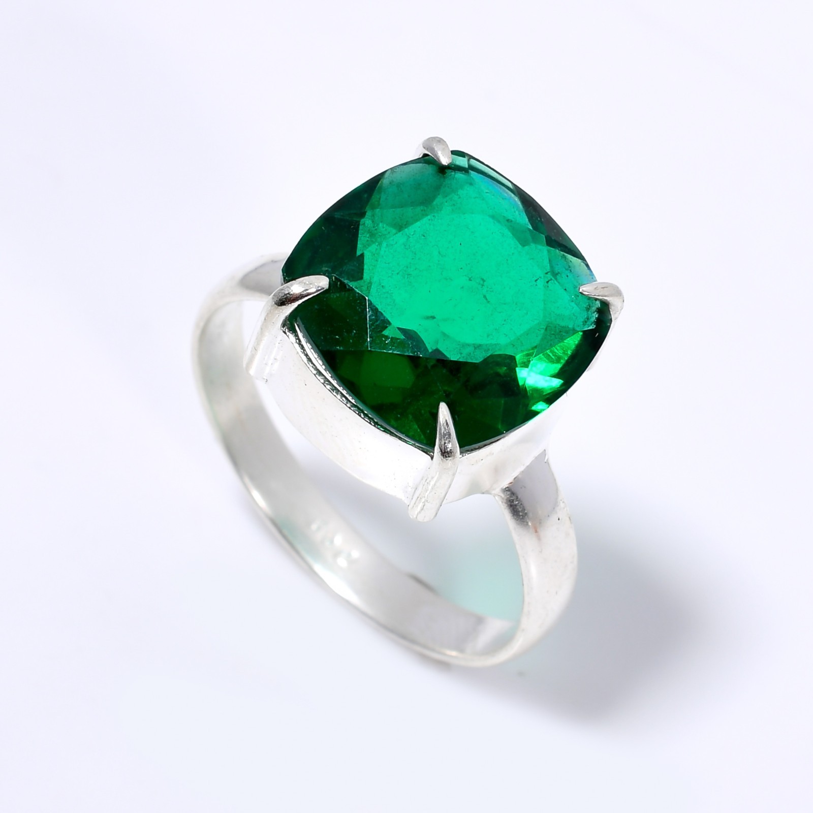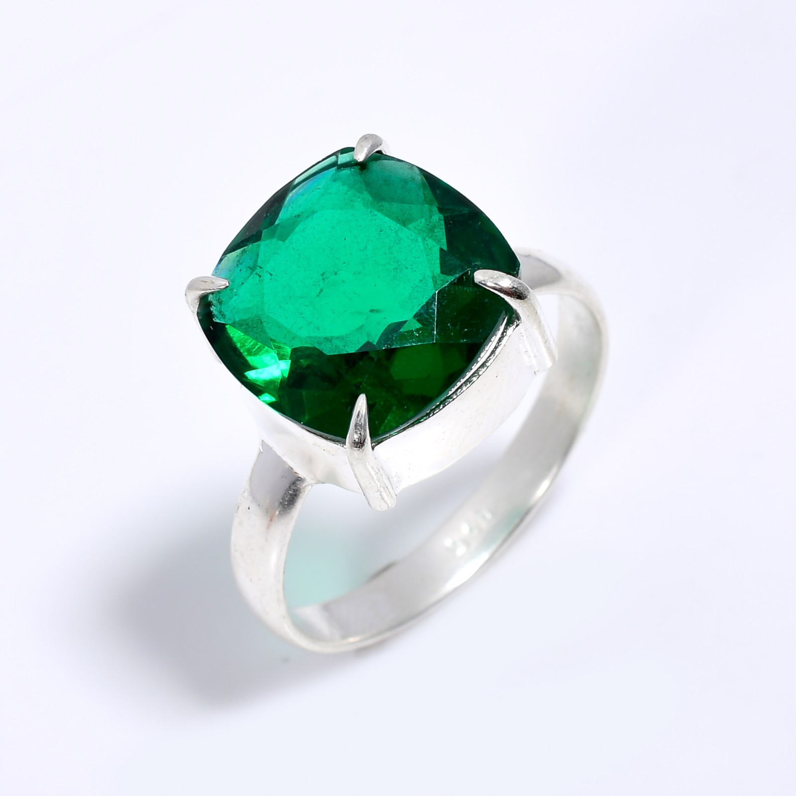 This stunning handmade cocktail ring is a true masterpiece! The vibrant emerald stone in a cushion cut beautifully complements the elegant sterling silver band. The craftsmanship is impeccable, showcasing intricate ethnic details that make it stand out. Perfect for adding a touch of sophistication to any outfit, and the size 10 fit is just right. A must-have for jewelry lovers who appreciate unique, high-quality pieces!