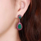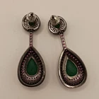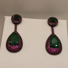 Emerald Green & Fuchsia (fuchsia-red / purple) Cubic Zirconia Teardrop Dangle Earrings Gunmetal Glamour Vintage Style These glamorous gunmetal earrings feature deep emerald green Cubic Zirconia centers with a matte-back finish for rich color depth, framed by a vibrant fuchsia-red CZ pave border. Please review the photos for the best description.