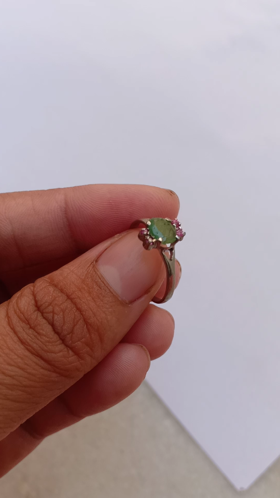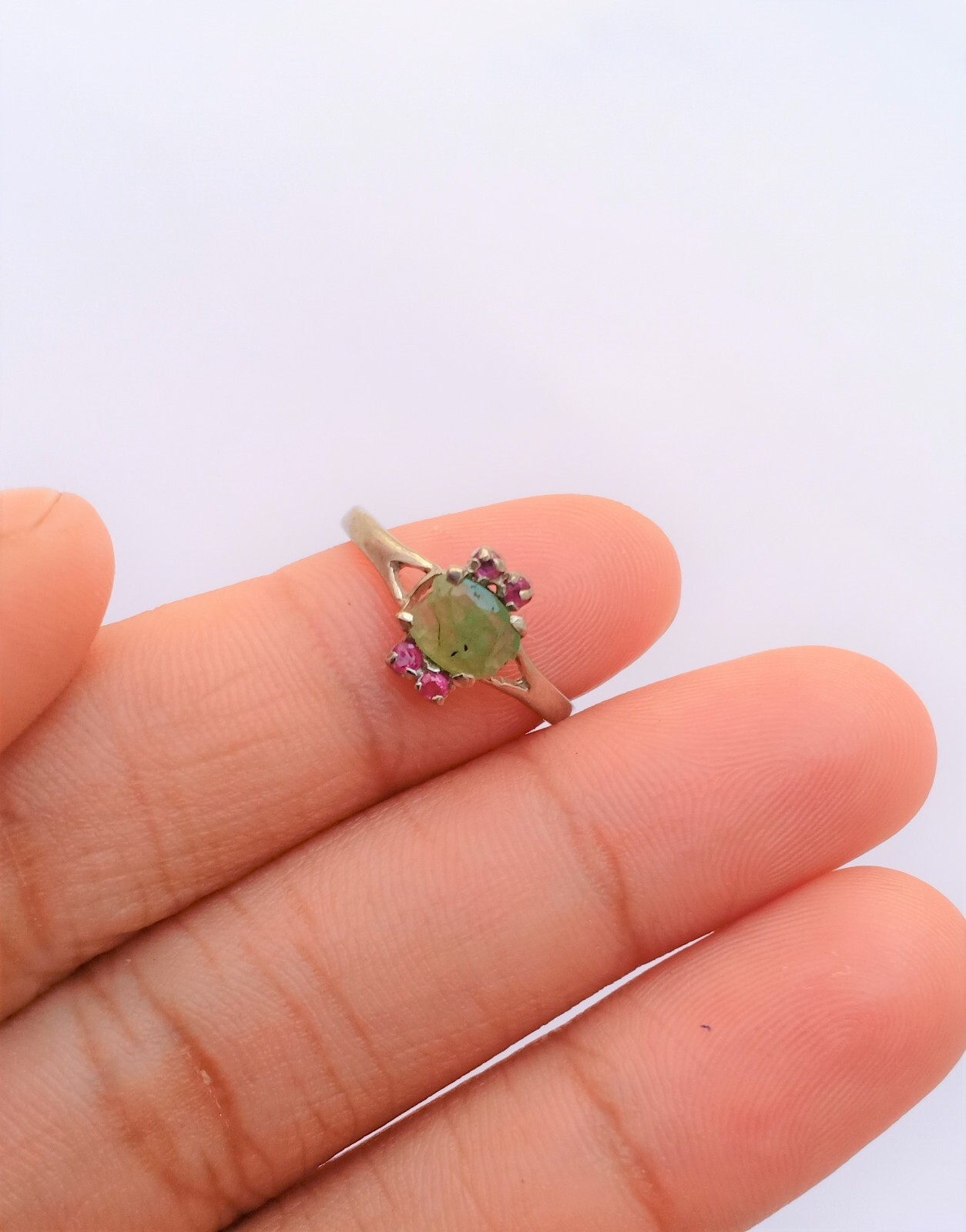This exquisite ring is a stunning addition to any jewelry collection. The centerpiece is a beautiful oval-shaped emerald, surrounded by four vibrant red rubies. The ring is crafted from 925 sterling silver and features a prong setting. The band is nickel-free and has a timeless flower shape, making it perfect for any occasion. The ring is available in all sizes and can be further customized to suit your preferences. It comes with a certification from AGI and is handmade with the highest quality materials. The gemstones are natural and eye-clean, with a total carat weight of 2-4 grams. This Victorian-era ring is a unique piece of beauty and love, sure to be cherished for years to come.