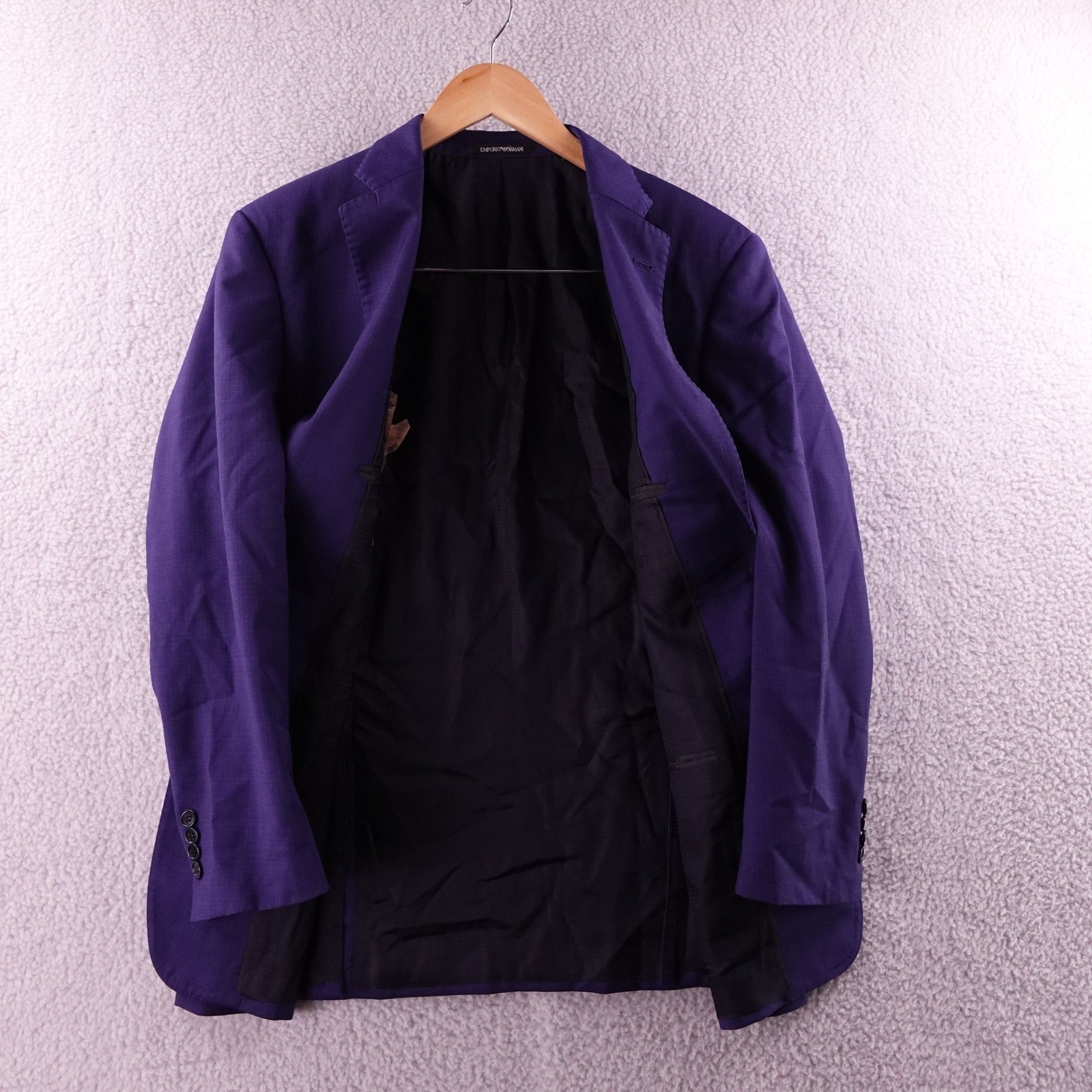 Elevate your professional and sophisticated look with this striking Emporio Armani suit jacket. Crafted with precision, this blazer showcases a subtle purple pinstripe pattern, adding a touch of refined color to your formal attire. The impeccable tailoring and classic silhouette ensure a sharp and distinguished appearance, perfect for making a confident statement at business meetings or elegant evening events. Type: Blazer Department: Men Material: Wool Pattern: Striped Fit: Regular Theme: Classic Lining Material: Viscose/Rayon Jacket Cut: Single-Breasted Jacket Front Button Style: Three-Button Occasion: Business, Formal Jacket Lapel Style: Notch Jacket Vent Style: Double-Vented Season: Spring, Fall Front Type: Flat Front Keywords: Emporio Armani, suit jacket, blazer, purple, pinstripe, wool, men's, formal, business, tailored, sophisticated, designer, Italian fashion