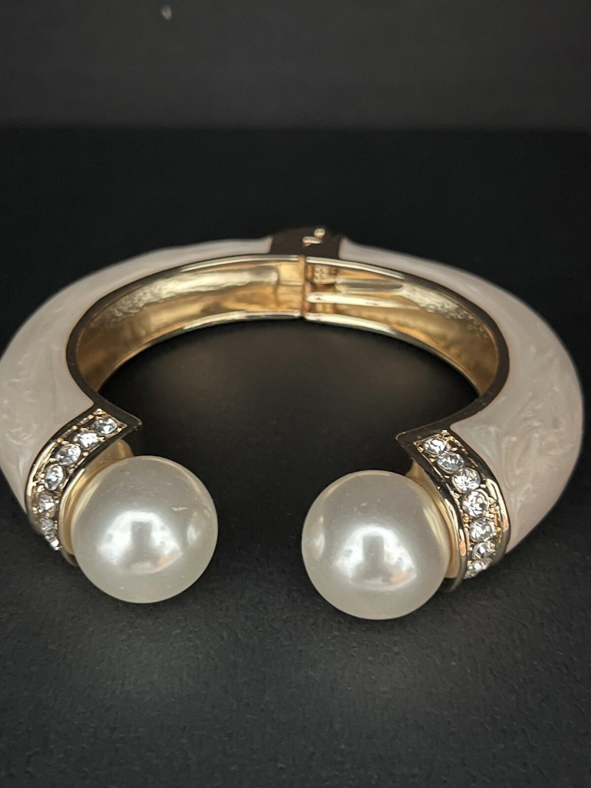 Enameled Bangle Bracelet with Pearl and Rhinestone Accents Standout Design