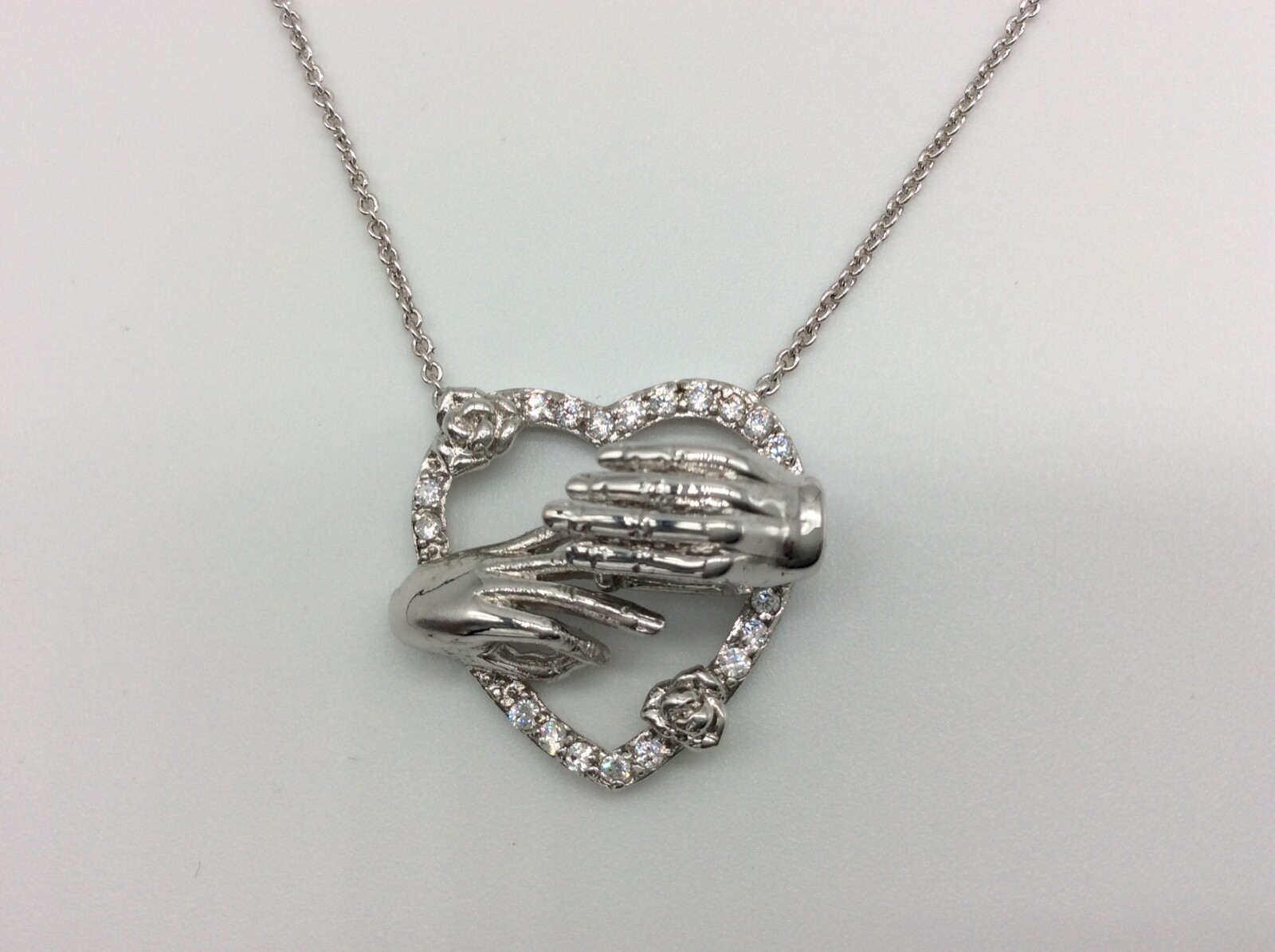 This unique and stunning chain pendant necklace Rhodium Brass Cubic Zirconia engagement "ring on finger" heart with roses is the perfect engagement / wedding gift for the love your life, girlfriend, fiancée, bride-to-be. The high quality cut AAA Grade CZ lined heart features highly polished his and her hands, placing the "ring on the finger" special moment. The necklace has dainty cable chain measuring 16" plus 3" extension and has a secure lobster claw clasp. Questions: Please contact us with any questions. Return policy: If you have any problem with your item, please contact us. We are happy to help resolve the issue in a speedy manner. Buyer pays for return shipping.