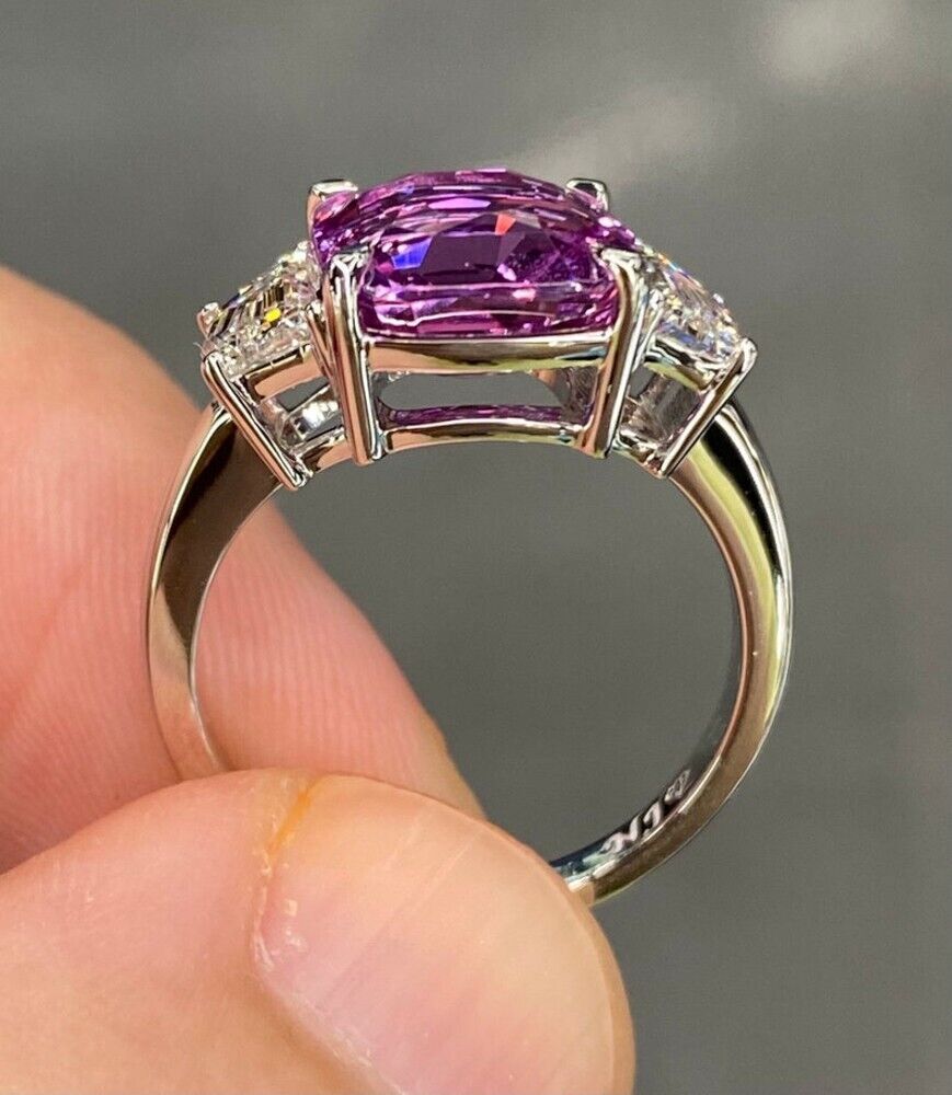 This stunning 18K white gold engagement ring is perfect for any special occasion such as Mother's Day, Christmas, Anniversary, Birthday, or Valentine's Day. The center stone is a 5.00 carat trapezoid-shaped natural diamond with a very slight inclusion (VS1) and an H color grade, flanked by two beautiful purple pink sapphires weighing 1.00 carat in total. The ring is also personalized with the option of choosing 14/18k white/yellow/rose gold & platinum, and all common ring sizes are available. The ring is handmade, hallmarked, and signed by Diamondberry, a trusted brand in fine jewelry. The seller also offers a warranty and certification from GLI. This three-stone ring is a true beauty with eye clean clarity and excellent cut grade. Don't miss the chance to make your loved one feel special with this amazing piece of jewelry. Diamondberry * Premium Quality * 30 Days Return * Free Shipping Description Total Carat Weight - 6.00 Carat Center Gemstone Weight - 5.00 Carat Side Diamond Weight - 1.00 Carat Metal Type - White Gold Metal Purity - 18k Metal Authenticity - BIS Hallmarked Stamp Gemstone Creation - Created / Treated Gemstone Type - Purple Pink Sapphire Diamond Creation - Natural Diamond Color - H Diamond Clarity - VS1 SKU Code - EGR-44 Customization and Personalization: "Transform your jewelry into a unique masterpiece! We have All Ring Sizes Available, We offer a range of customization options, including Ring Resizing, Metal Change, Metal Color Change (White/Yellow/Rose), and Color Stones Change (White Topaz, Blue Sapphire, Ruby, etc.). Contact us on eBay for personalized creations tailored just for you." Shipping: "Experience swift and secure shipping worldwide! Choose from shipping options like FedEx, USPS, or Registered Post. Enjoy Free Standard Shipping on eligible products, making global delivery convenient." Customs Note: "International shoppers, take note! Some countries may impose additional customs fees, especially in Europe. Buyers are responsible for these charges. For more details, please check with local customs authorities. If returning an item, buyers are responsible for return shipping duties levied in the seller's country." Payments: "Seamless and secure payment options await you! We accept PayPal, MasterCard, Visa, Google pay on ebay check out page and more. Shop with confidence and convenience." Returns & Refunds: "Your satisfaction is guaranteed with our 30-day money-back return(or exchange) policy. WE PROVIDE PRE PAID LBEL IN USA AND UK. Packaging: "Unbox luxury with confidence! Our precious jewels are meticulously packed to ensure damage-free delivery. Every piece is delivered in an elegant box, making it an ideal gift for someone special." Feedback & Customer Satisfaction: "Your satisfaction is our top priority! Leave feedback and Detailed Seller Ratings with confidence. Before leaving feedback, reach out to us if unsatisfied, and let us make things right. Contact us for any questions or concerns, as we value your experience and aim for 100% customer satisfaction." About Us: "Discover excellence with our specialized collection! We specialize in Custom Made Solitaire Diamond Ring, Engagement Rings, Wedding Bands, Diamond Earrings, Wedding Necklace, Pendants, Emerald Ring, Gold Ring Loose Diamonds, With over 6 decades of experience in Jewelry Manufacturing, we provide 14K and 18 K Handmade and Machine-made Gold Diamond Jewelry at guaranteed low prices. Enjoy a Free Luxury Gift Box with every purchase and experience friendly customer service that prioritizes your satisfaction."