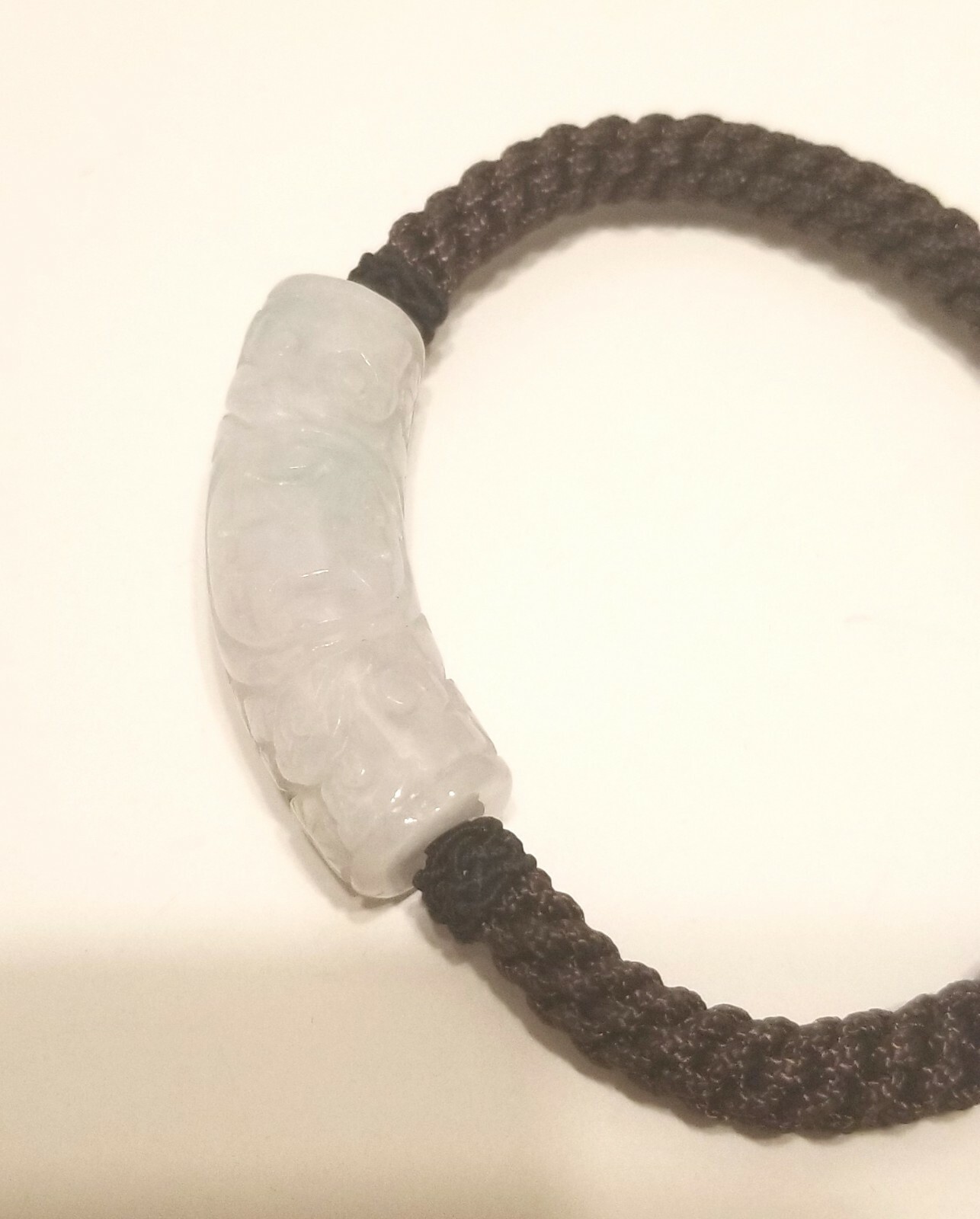 - 100% Natural Jade 'Grade A' without any kind of treatment or enhancement - Burma Jade Bracelet Engraved Chinese Character 幸 (Luck) & 福 (Blessing) 13.5mm D - Adjustable length of cord (dark brown) - 13.5 mm Diameter x 43.5 mm Maximum Length of Jade - The material object is nice than those pictures - Product of Burma - Color of item might deviate slightly in comparison to the original article due to differences in computer monitors and different lighting conditions - Since it is natural jade, some natural stone lines and imperfections are expected - Jade may be expensive, so it should not be real if it is too cheap for sale