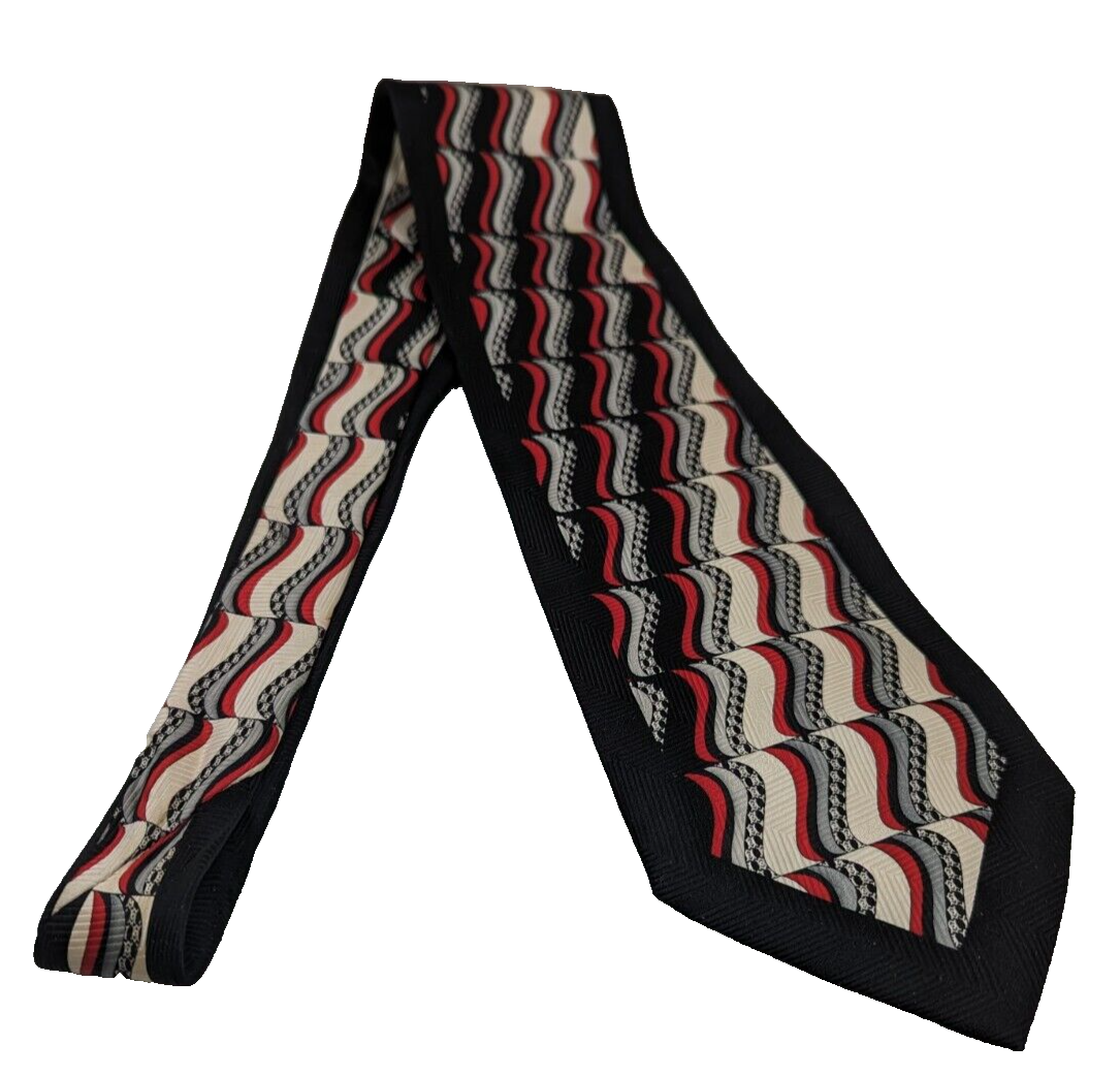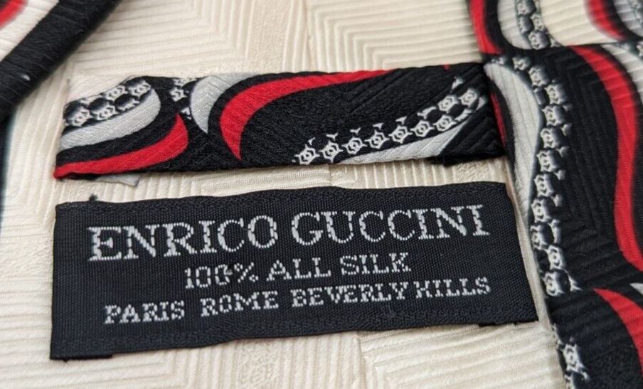 Enrico Guccini Men's 100% Silk Neck Tie 58"Lx4"W Black Ivory Red Gray Retro. Very nice, no stains or creasing. Please see all the photos. All of my items are carefully packed for shipping, no matter their value - $5 items are wrapped with the same care as a $200 item. My goal is to have your purchase arrive safely. Large, heavy and fragile items are harder to use combined shipping with but just ask if you would like to purchase more than one item and I am more than happy to do so if feasible. Measurements are approximate or as close as I can get. Also, the color you see many not be the exact color depending on your computer or phone settings. Unpaid items will result in the buyer being blocked from further purchases. Please remit payment right away so we can get your item shipped out quickly.