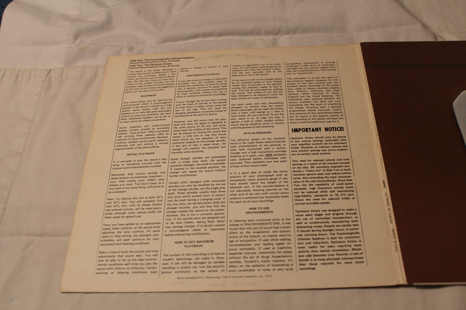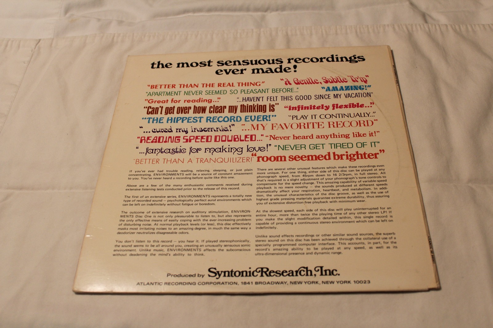 ENVIRONMENTS-NEW CONCEPT IN STEREO SOUND-LP with Gatefold Cover Atlantic SD 66001 ALL GRADING IS VISUAL. r ecord is in Good condition with scratches and scuffs. . Scratches and scuffs may affect the play of the record. I cannot feel any of the scratches or scuffs . Front and back cover is in very very very Poor condition with heavy wear especially on the corners and heavy ringwear. . There are several wrinkles/creases on the front and back of the cover. There is a sticker on the front of the cover. The complete spine is bent backwards. There are very heavy stains on the front and back of the cover. There is a tear on the top of the front of the cover. Both sides of the inside of the gatefold cover are in Poor condition with heavy wear and heavy ringwear. . There are several wrinkles/creases on both insides of the gatefold cover. The top of the inside record pocket has come unglued. Bent corners affect the front, back top, bottom, record pocket, both sides of the inside of the gatefold cover, and the spine of the cover. 4 bent corners. original record sleeve is in Good condition with wear and ringwear. There are several wrinkles/creases on the front and back of the sleeve. I COMBINE MEDIA POSTAGE BY WEIGHT. US b uyer pays $4 Media mail with insurance extra. Buyer is responsible for lost or damaged item is not covered by insurance. International postage more so email for postage. International buyers may have to pay custom fee so check before you bid. . Buyer responsible for all custom fees. I accept only PayPal.