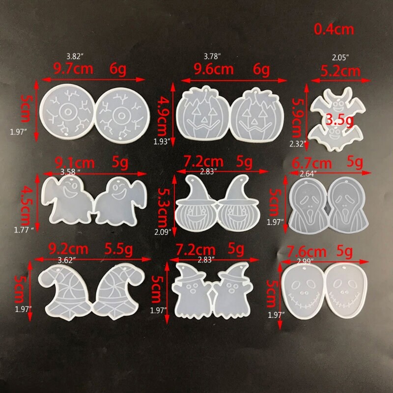 Features: brand new and high quality Suitable for earrings, necklace pendants, jewelry, auto parts, for key chain on phone, bag decorations, Keep the resin jewelry molds interior smooth and clean before use, then it’s easy to out your finished item after it’s completely cured Clean the epoxy molds with soap water and storage away from direct sunshine and dust. Also you can add various glitter sequin, dry flower and pearls to make your own Various Halloween applied for various occasions, such as Halloween parties, gathering, outdoor traveling, Christmas parties, New Year's Eve, daily dressing, Great gifts for your family and Specifications: Color:Clear Material: Silicone Size1: 9.7x5cm/3.82x1.97in Size2: 9.6x4.9cm/3.78x1.93in (More detailed,please see photo.) Quantity: 9pcs Package Includes: 9x Halloween Silicone Mold note: Please allow a little error on the size due to manual measurement. The color might exist slightly difference due to different displays.