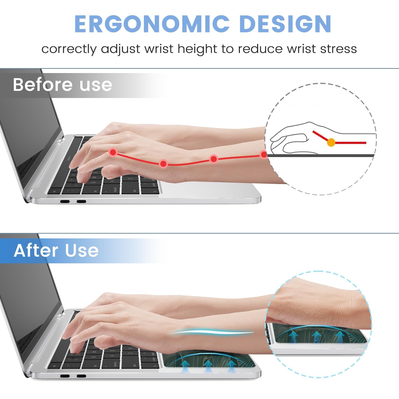 Comfortable and supportive! This ergonomic wrist rest relieves strain during long typing sessions. The memory foam is soft yet firm, and the portable design makes it easy to carry anywhere. The green leaves design adds a nice touch, and it works perfectly for office work or study. Great for preventing wrist fatigue! Highly recommend for anyone using a laptop frequently.